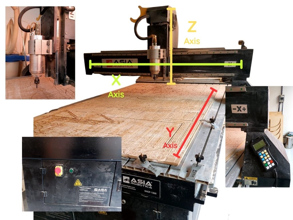 I could recognize the main components, such as the control panel, the head where the tools are placed, the vacuum table or work area, among others.