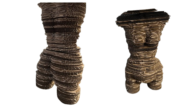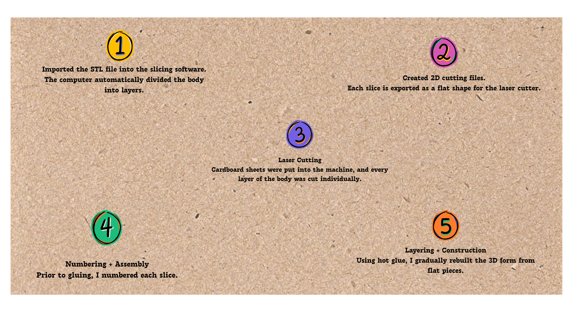 My inspiration came from the fact that fashion is continuous creation and not an instantaneous process. It's trial and error, reconstruction, and shaping. Creating the mannequin out of the laser cut cardboard slices felt figuratively powerful, building piece by piece. Each layer becomes a part of the foundation, just as every experience shapes who we(I) are as designers and individuals.