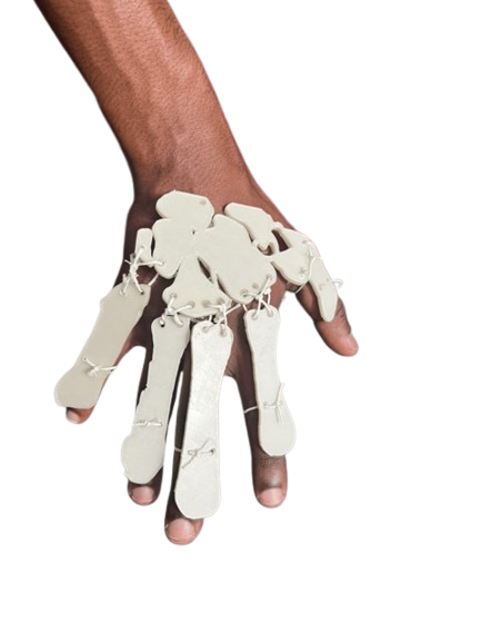 After printing, I focused on the structure and movement. Shortly after I tested my prototype and decided to use jewelry cording instead of the first idea of using the cable chain link to connect the parts to replicate hand movement because it was lighter, more flexible, and easier to work with with the open holes I made to help attach them together, which also allowed me to be able to control the fit around the finger loops.