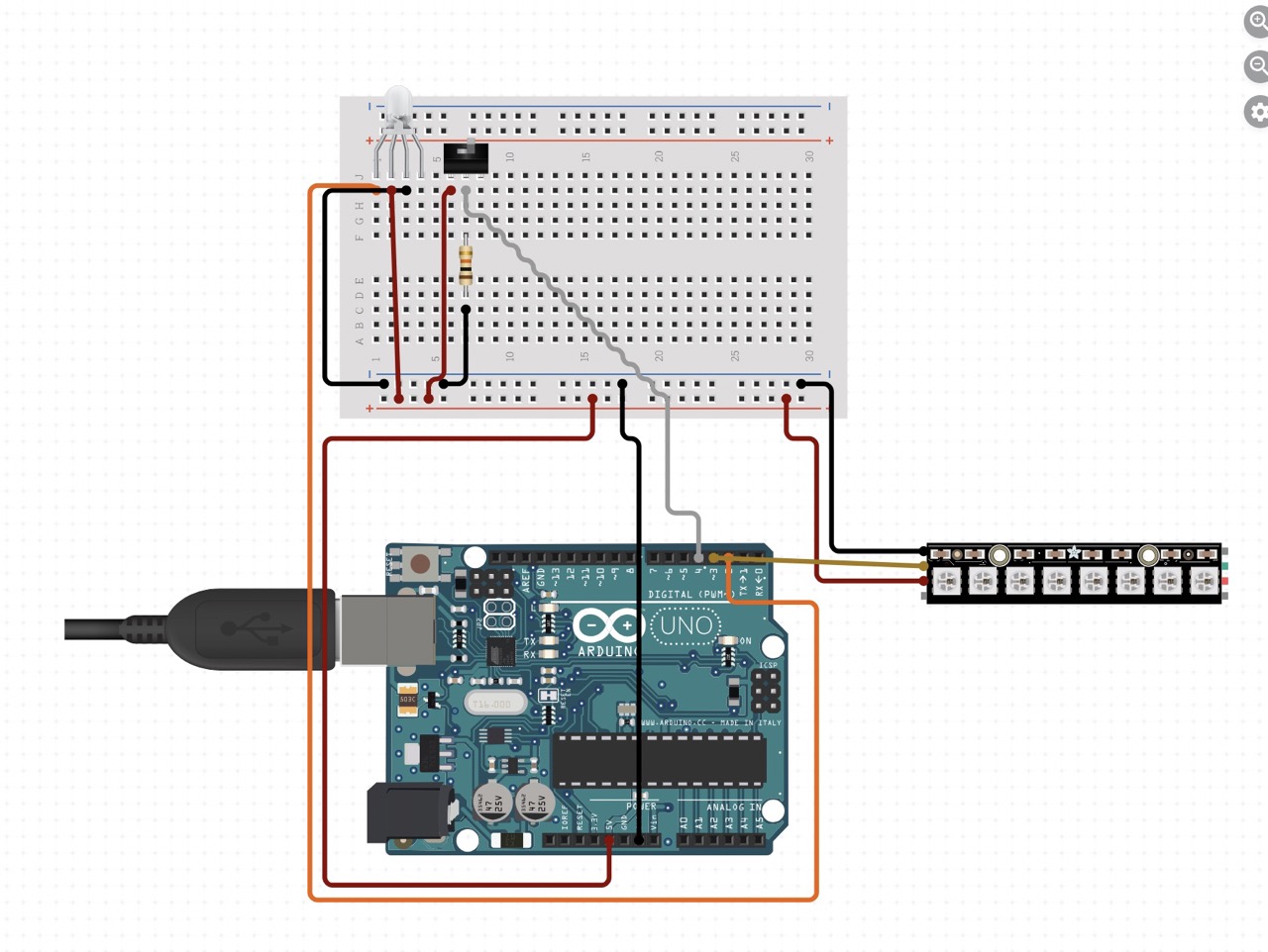 The LED strip’s data pin was connected to Pin 10 on the Arduino Uno. Power and ground were connected through the breadboard. The Arduino was powered through USB for testing and programming