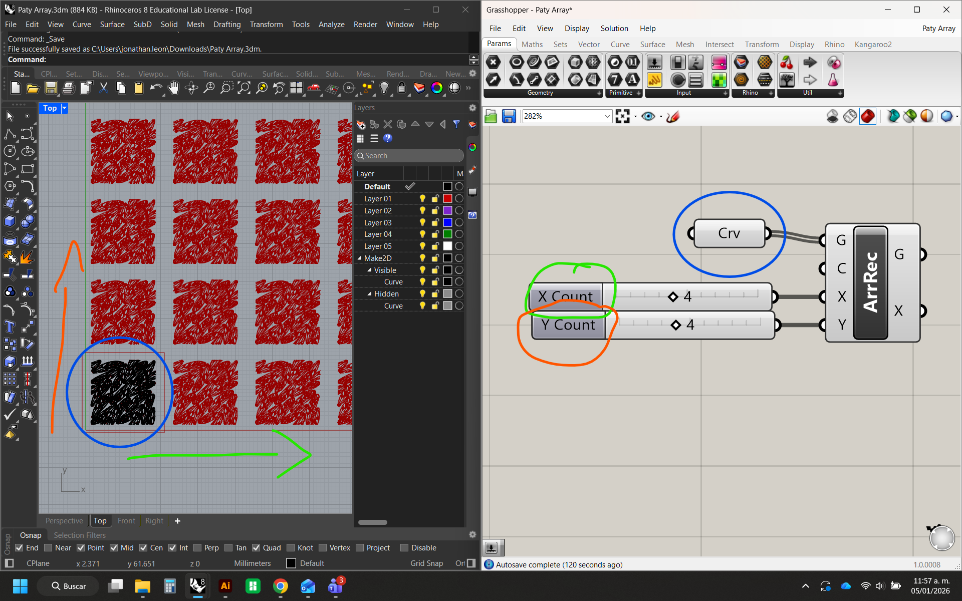 I am going to try to explain what I did. On the left low corner, circle in blue, there is a component curve, which containes a dymanic group of curves ( the ones I had already made), the green arrow represen the movement that help me control the number of copies of the group of curves in X and the orange arrow the number of copies in Y. Here is a small video of this.