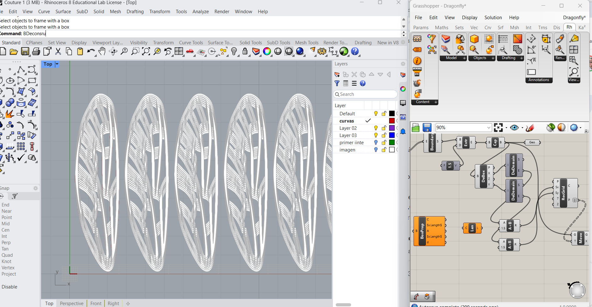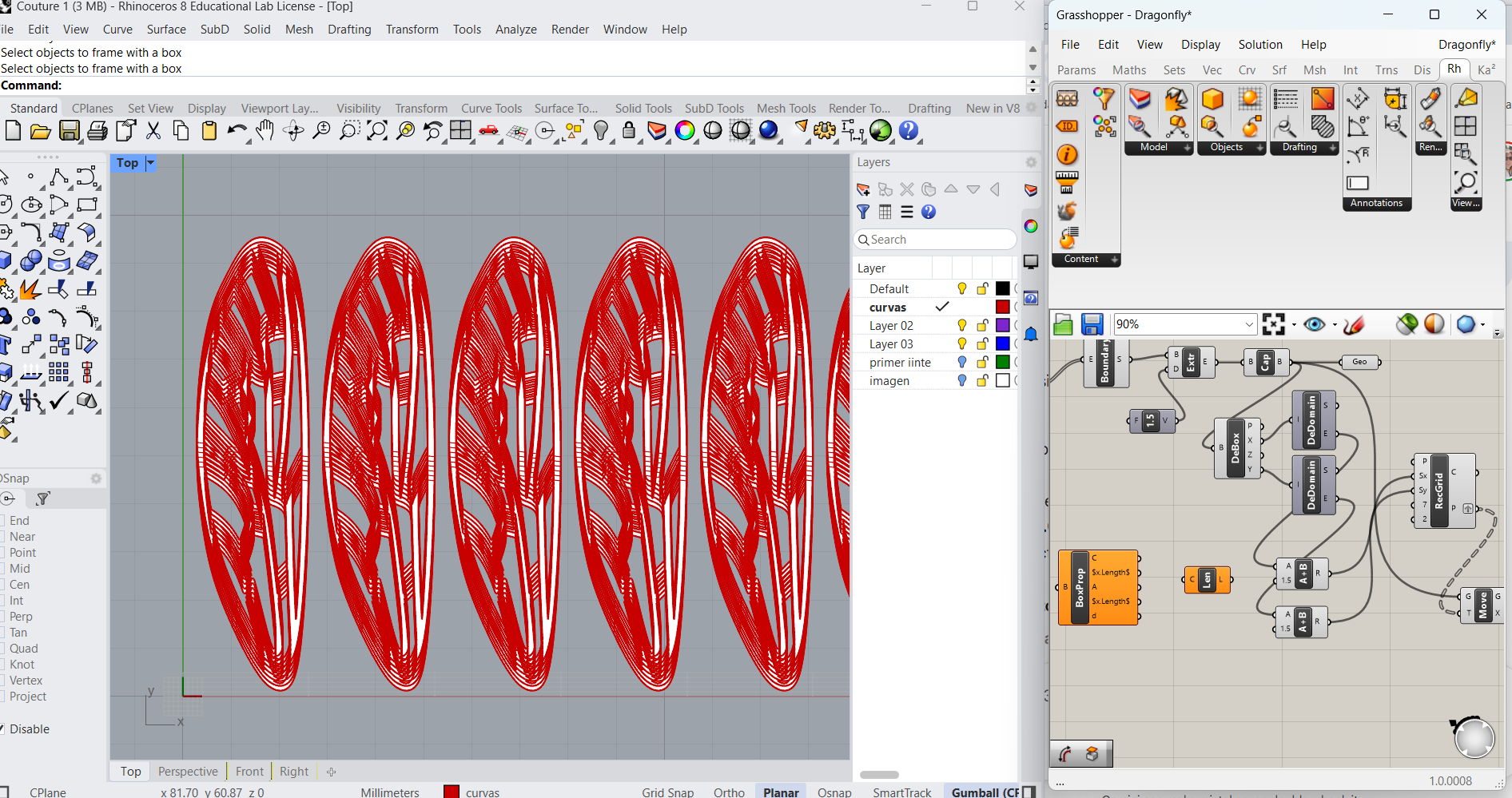 I wanted to make another sample that the shapes could move and I wanted to try it with a different textile, but this time not in a sandwish form. I did not have time to print it, but I share with you can show you my model in Rhino.