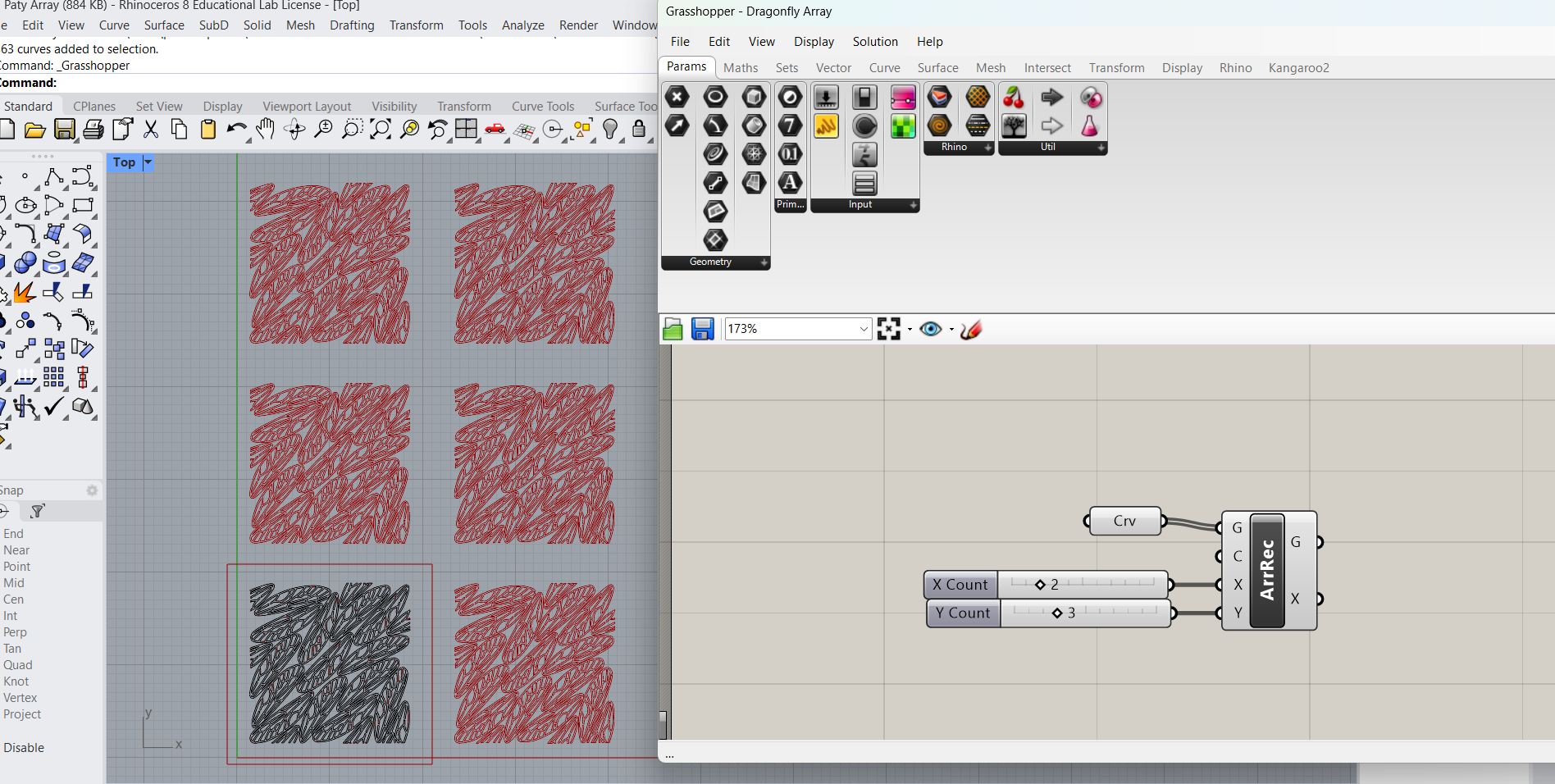 I made a parametric array of the dragonflies I had. I may addmit that I am new using GrassHopper but I manage to do something. The first picture represent the dymanamic group of curve thaA I had already made in 2X2 Array and the second one shows the 4X4 Array.
