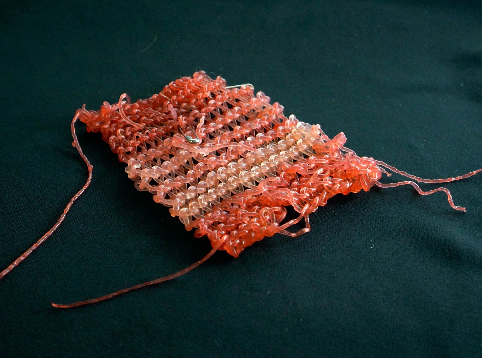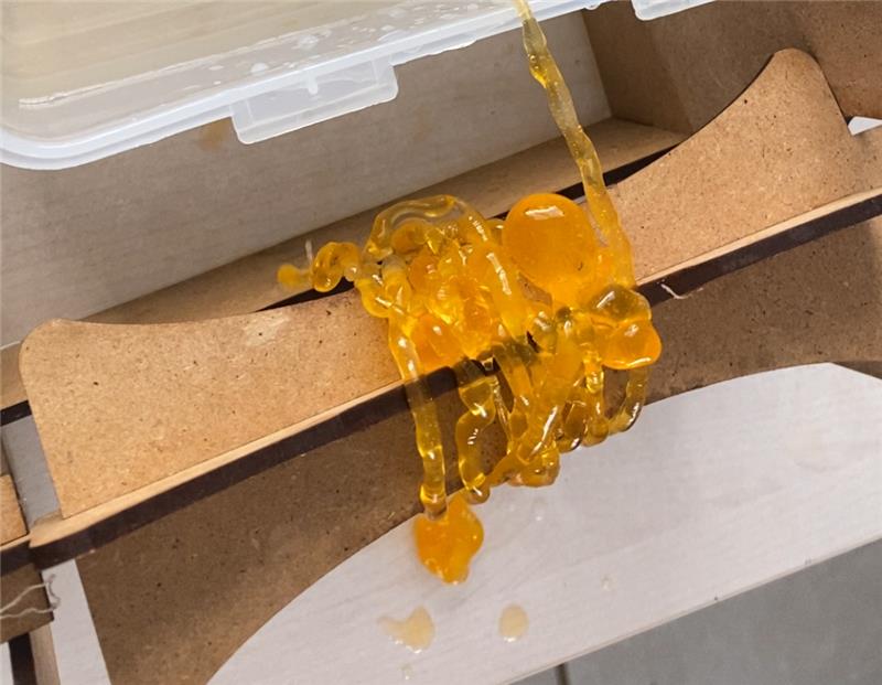 This time I took the alginate vat out of the machine and I decided to use a ketchup struder for the alginate to create a bio foil and tried to get a longer tread to be able to knit later on. I poured all the solution into the struder with a little of natural orange food pigment and then pored it into the Calcium chloride solution. It was not as easy as I though because the nozzle was clogged and That made an non even foil, but at the same time It made it look nice and different.