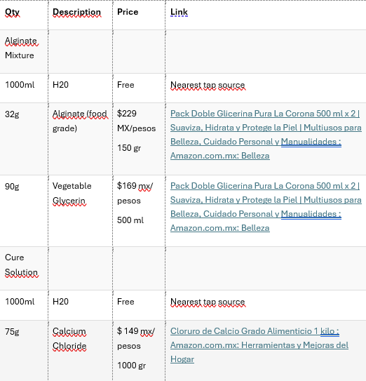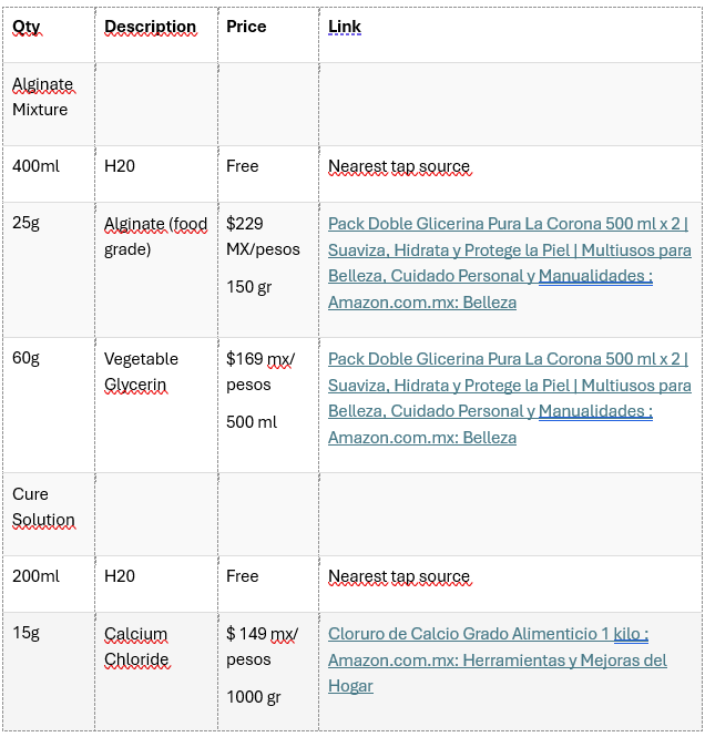 First, I will need all the ingredients for the bio yarn which are mentioned in this table: