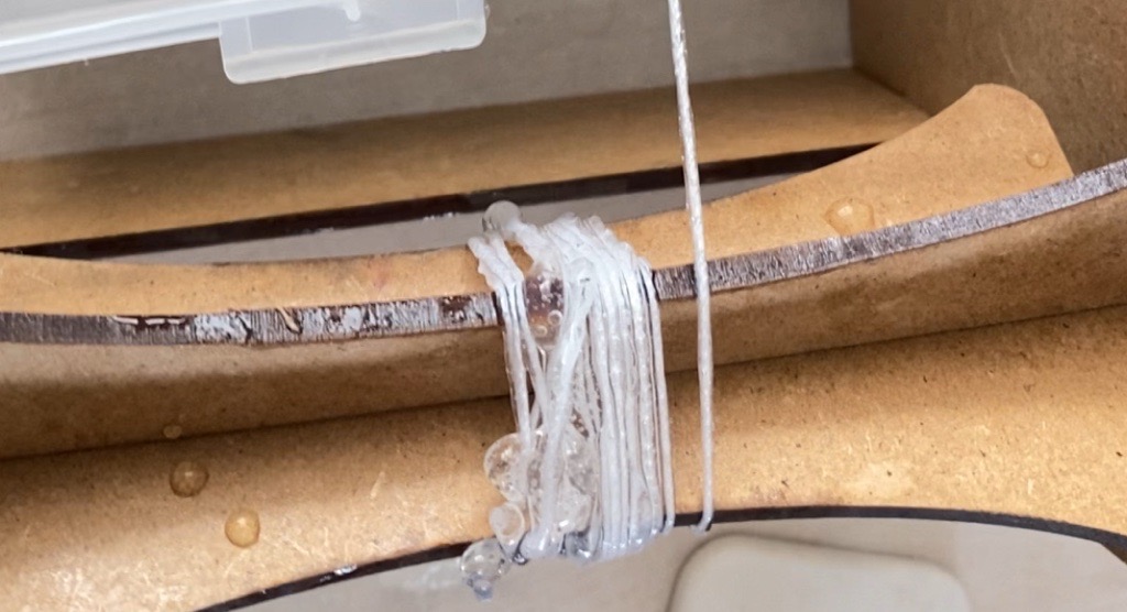 During my first attempt, I used a black 100% cotton mercerized thread. I introduced the tread into de alginate mixture vat and pooled it into the calcium chloride vat and then into the clear water vat. I notice that the alginate solution was too thick and stiky and as well I noticed that there was and error on the the correct amount of substances and water because the thread did not slide smoothly through the different vats because thee hose did not touched the solution and therefore the tread could not be pool easily.