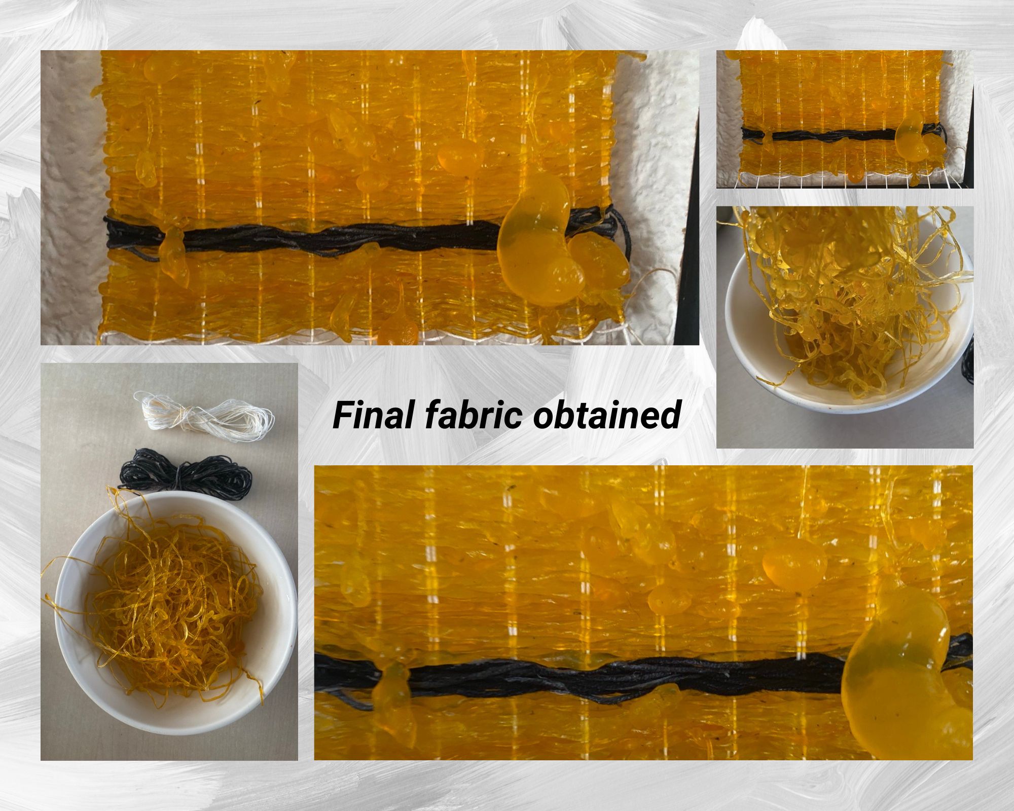 After I finishes doing the three samples I let them dry and the next day I created a small loom using the 100% white bio cotton as the warp and the bio foil and the black mercerized tread as the weft. It was reall funn to do it and I loved the result.