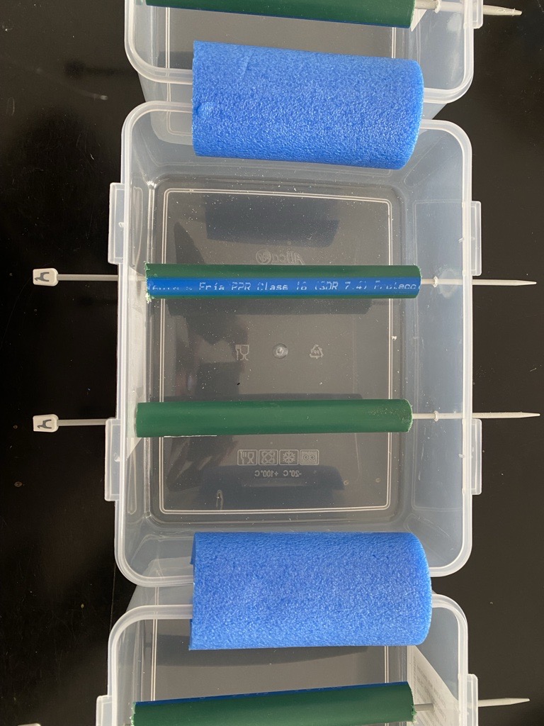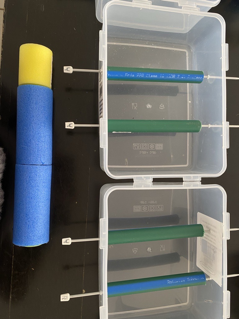 Once I got them all, I measured the boxes on the narrow side of the rectangle, and I divided them into 4 and at the middle on the height, so my holes would be exactly at the same level. Once I marked the exact points I proceeded to make the holes. For that I used the knitting needles because they are metallic made. I heated them on the stove and then made the holes in the boxes. I introduced the hoses through the needles. Then with the silicon pistol I sealed the holes on the boxes. When this process was finished, I cut the plastic from the water pistol in half, pulled it out and then again in half to attach each piece into the union of the boxes.