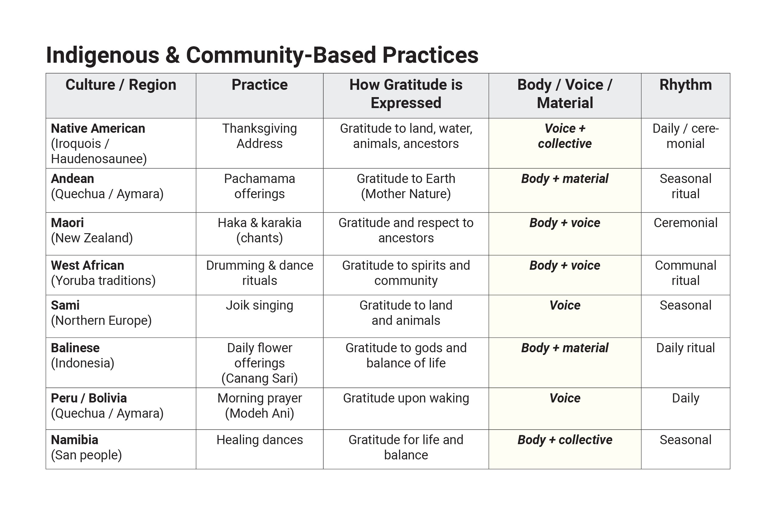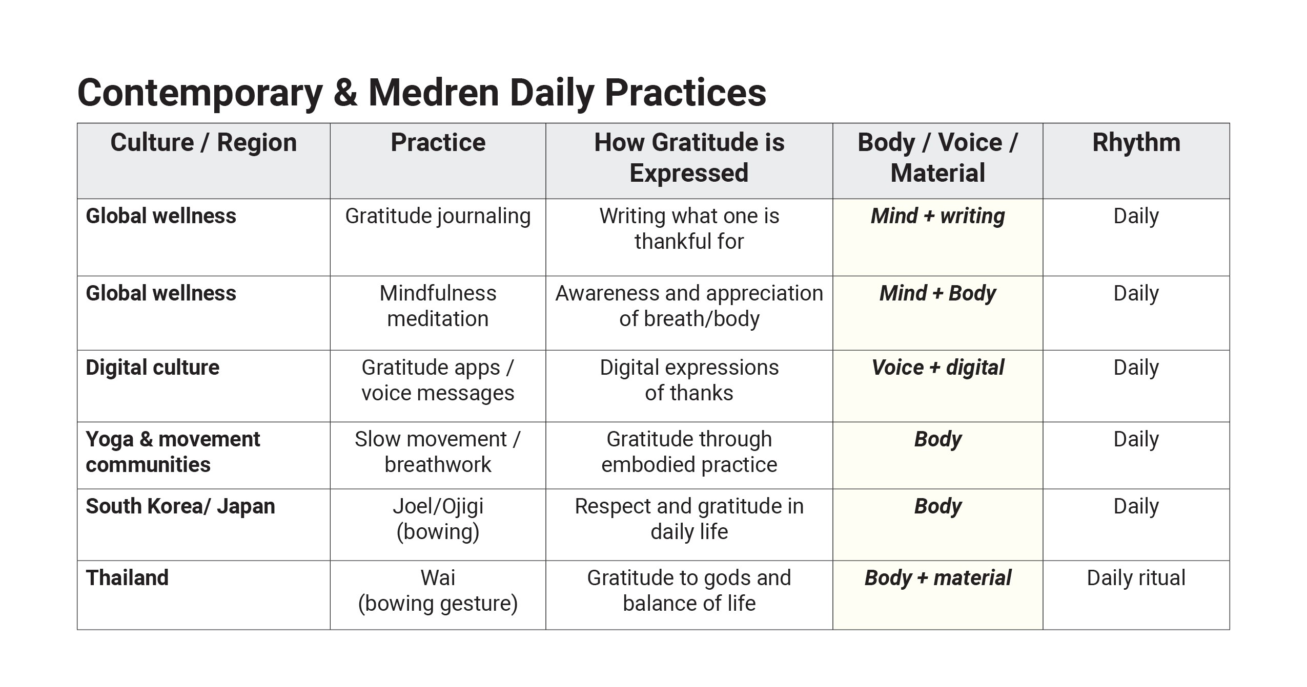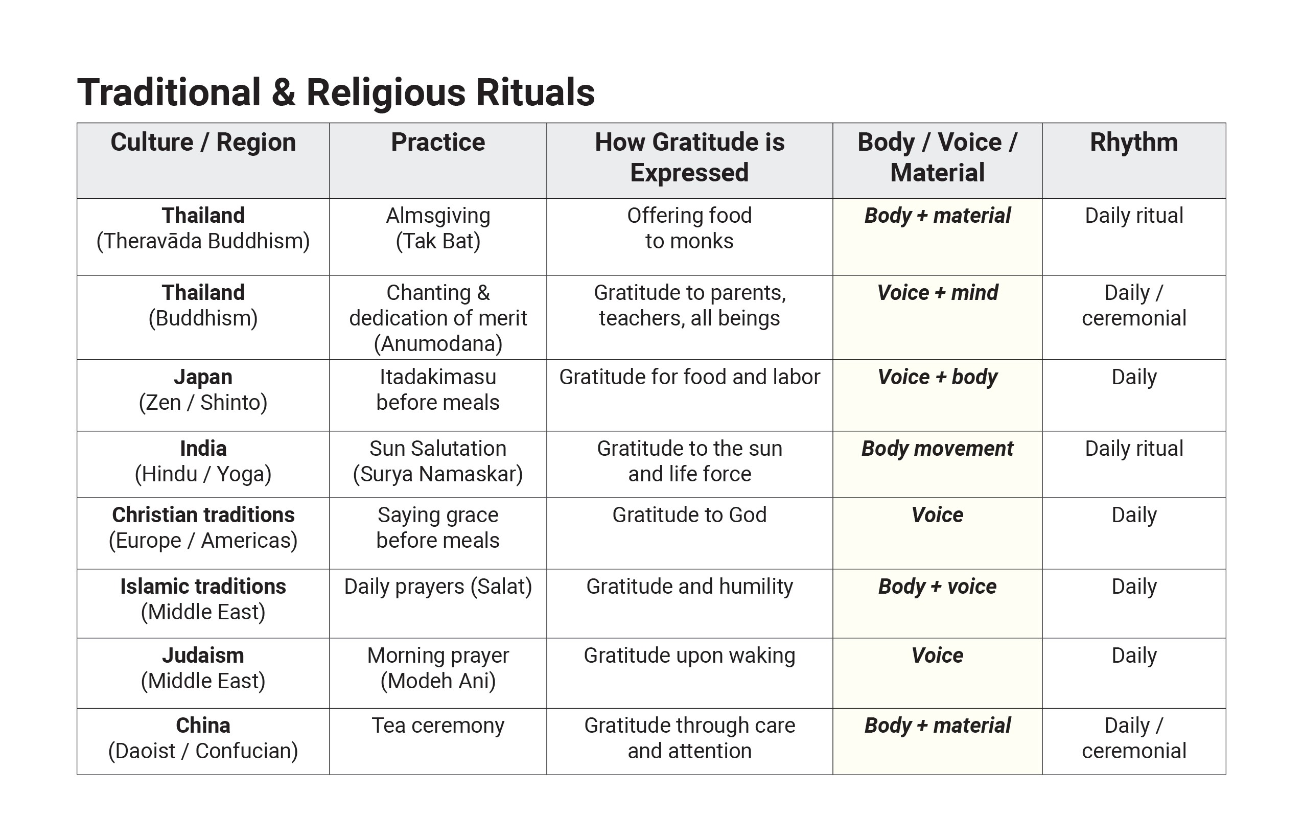 Research table of existing gratitude practices across modern and traditional cultures, focusing on voice, bodily action, and material expression. — Pattaraporn (Porpla) Kittisapkajon