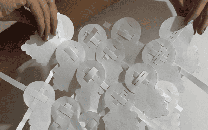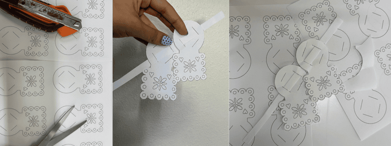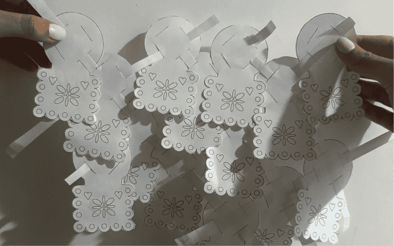 I removed my pieces from the laser cutter; there were 50 in total. When leather is laser cut, the edges burn and release a black powder that stains hands or any surface it comes into contact with, so it is necessary to wash it with water and dish soap (this also helps reduce the odor). After washing the leather, I let the pieces dry for one day on flat surfaces to prevent them from deforming.