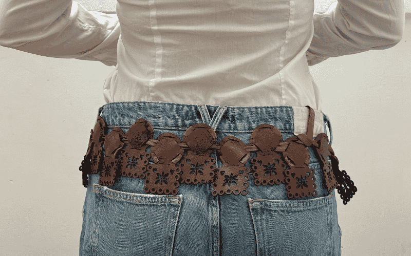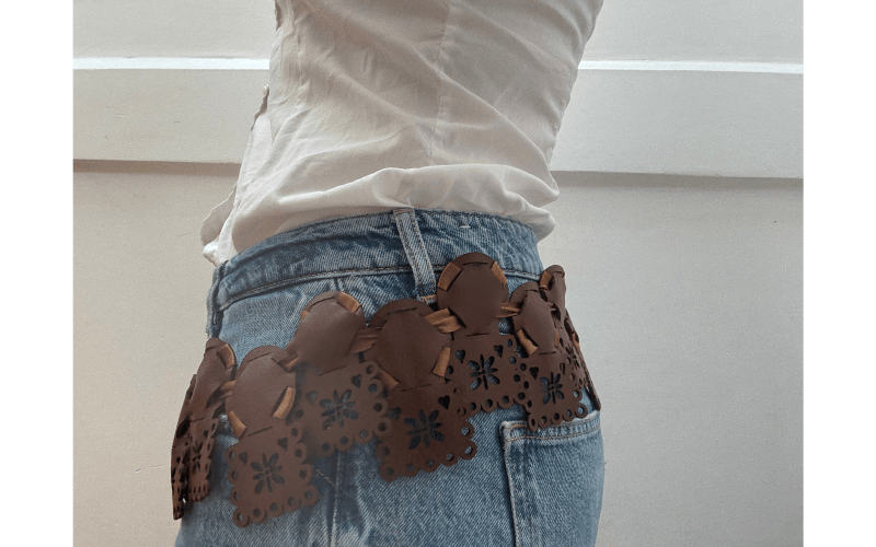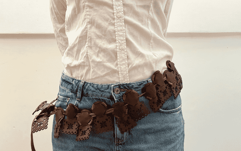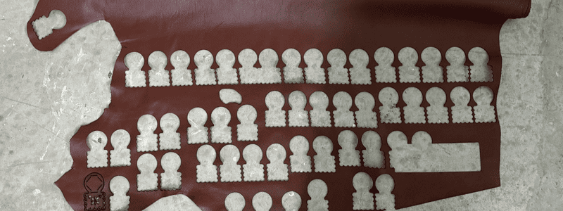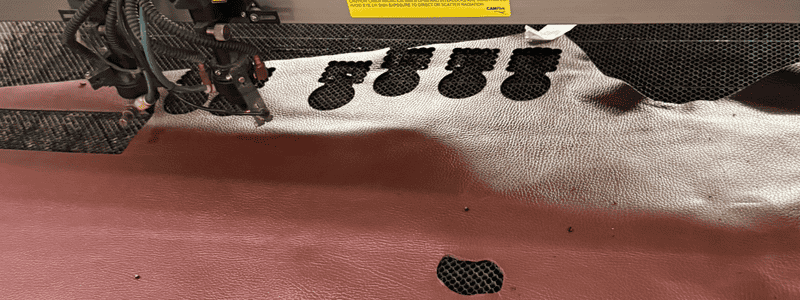 I started by placing my leather on the laser cutter bed. I arranged it as efficiently as possible to minimize material waste, so I cut the pieces in sets of five, or even one by one when necessary.