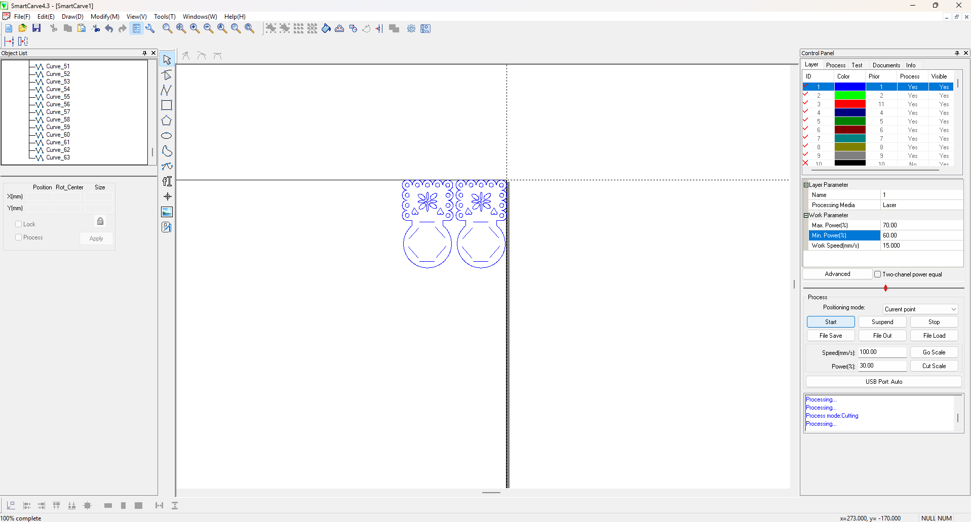 In SmartCave, I imported my design and arranged it. I used the same cutting parameters throughout the entire project. I tested different speeds and power settings until I found the correct ones to cut my leather properly. These are: