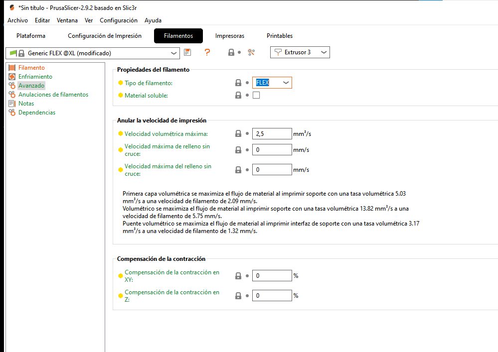 I made a second printing test using the Prusa and TPU, which is another type of plastic, a more flexible one. This time, I only secured a piece of denim with tape along the edges and parametrized my design in PrusaSlicer. You can see this process in more depth in my Textile Scaffold week. The only additional step I added was changing the nozzle and the material. I went to the top menu bar > Filaments > Advanced > Extruder > Filament type > Flex.