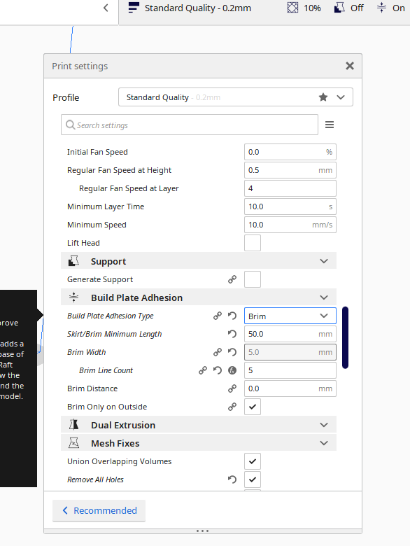 - Generate Support → disabled / Right Panel → Build Plate Adhesion→ Brim