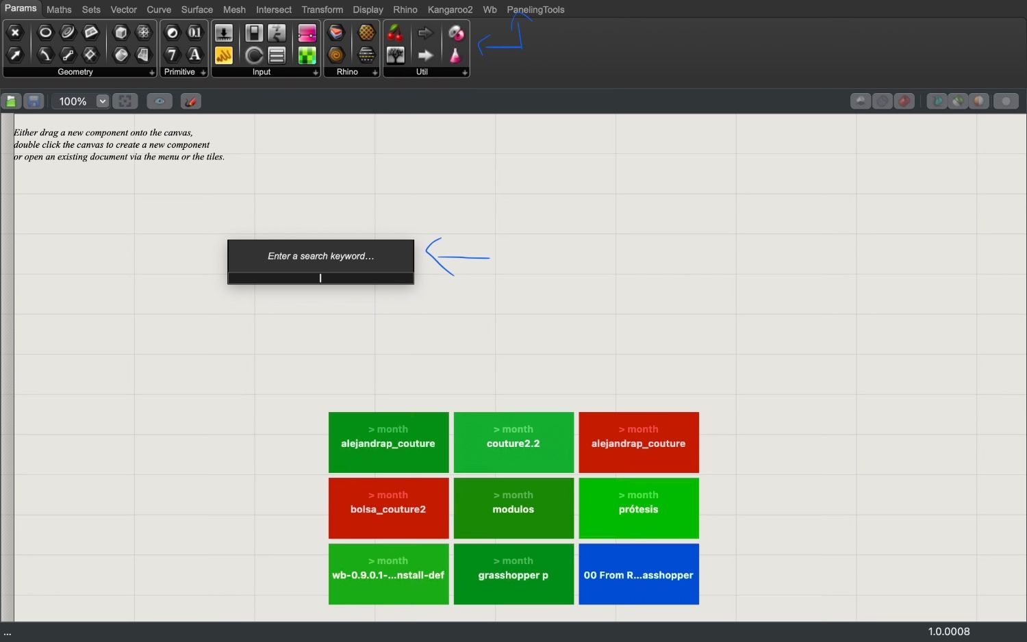 On the main page, once you open GH (Grasshopper), a menu with colored cubes appears showing your saved past projects. If you don’t have one yet, to start adding components you can either search for them in the top bar or double-click on the beige workspace, where a search bar will appear so you can type the name of the component you want.