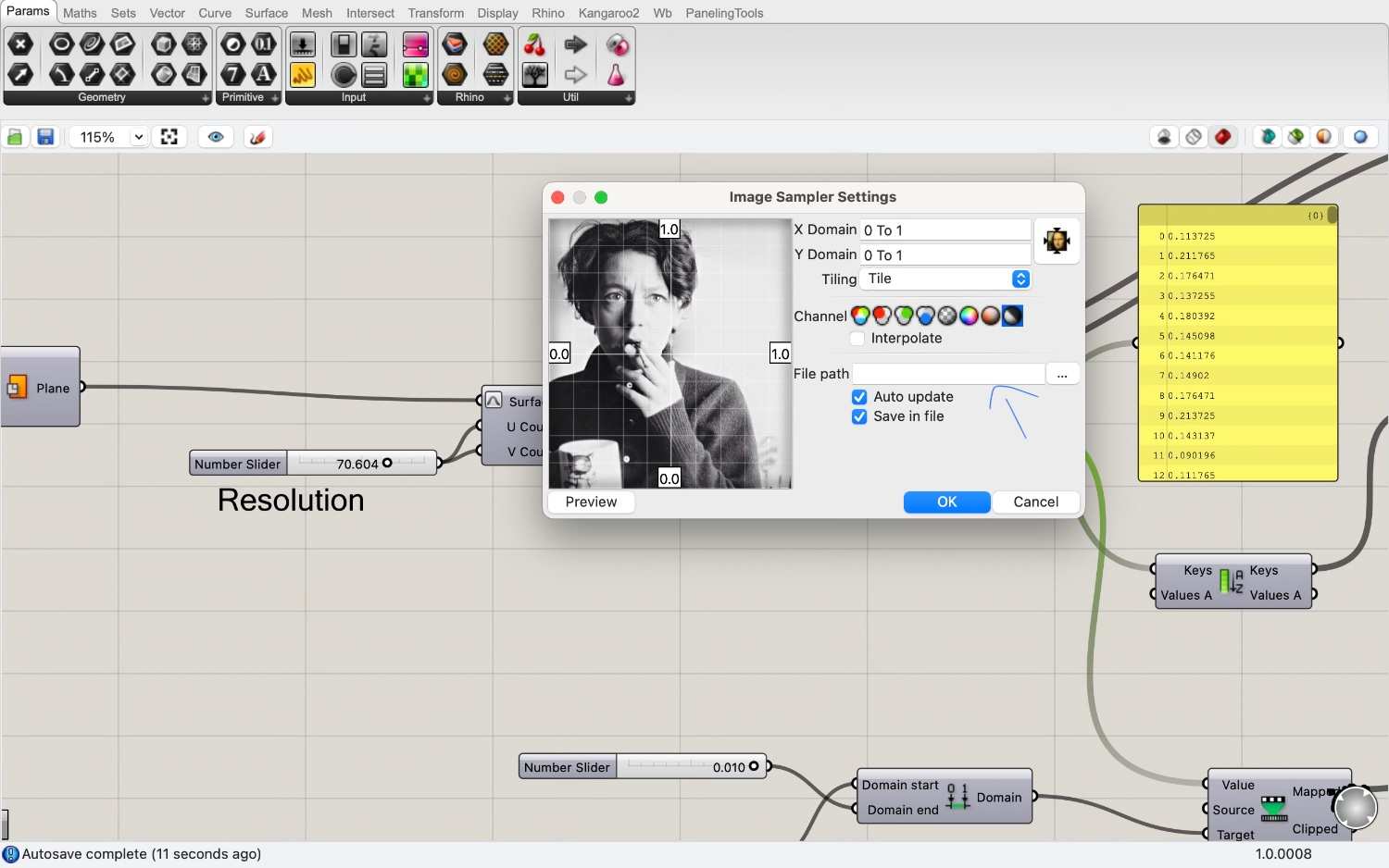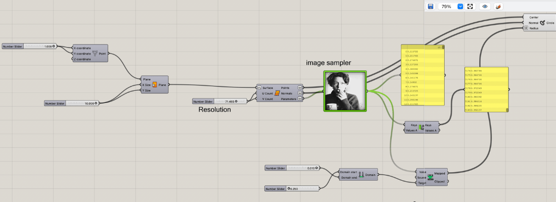 These are the main components for my final result; numer silder for the image resolution and distribution, connected to image sampler where you can upload any picture or image you just double click on the square and a menu should pop out, thre´s a search bar were you can type in the file path of your image.