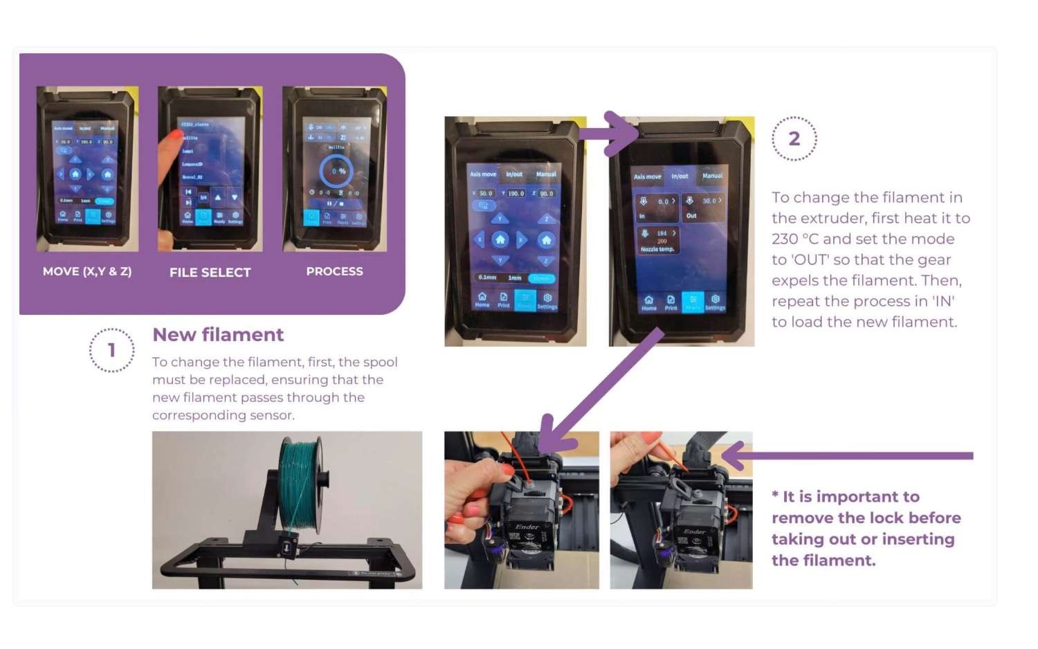 There is also a complete procedure for properly changing the filament, which is important to avoid clogs, uneven extrusion, or print failures. This process usually involves heating the nozzle to the correct temperature, unloading the previous filament, carefully inserting the new filament, and extruding a small amount to ensure a smooth and consistent flow.