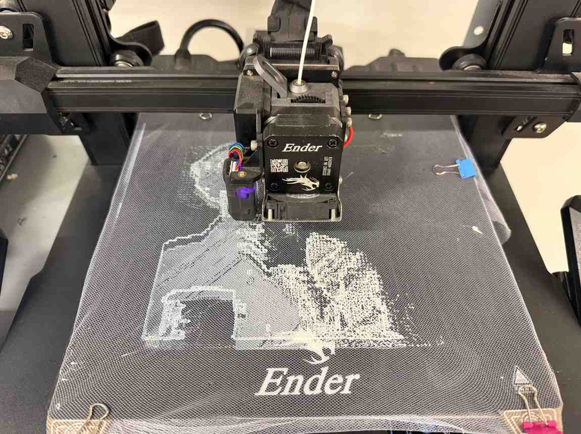 As mentioned before, after the first layer is printed, the machine will pause. Once this happens, it is the ideal moment to place your piece of fabric, in my case I used tulle, and secure it with clips along the edge of the print bed.