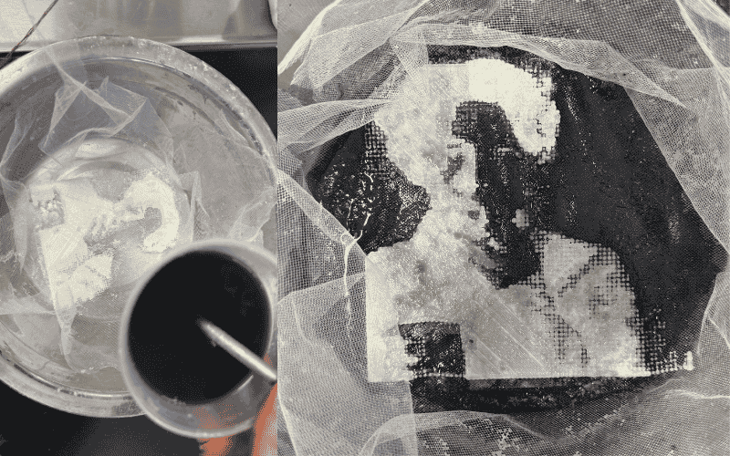 - Pour the mixture into a container and suspend your material to be crystallized from the corners above the solution. It is important that the piece does not touch the bottom, as this may prevent proper crystallization.