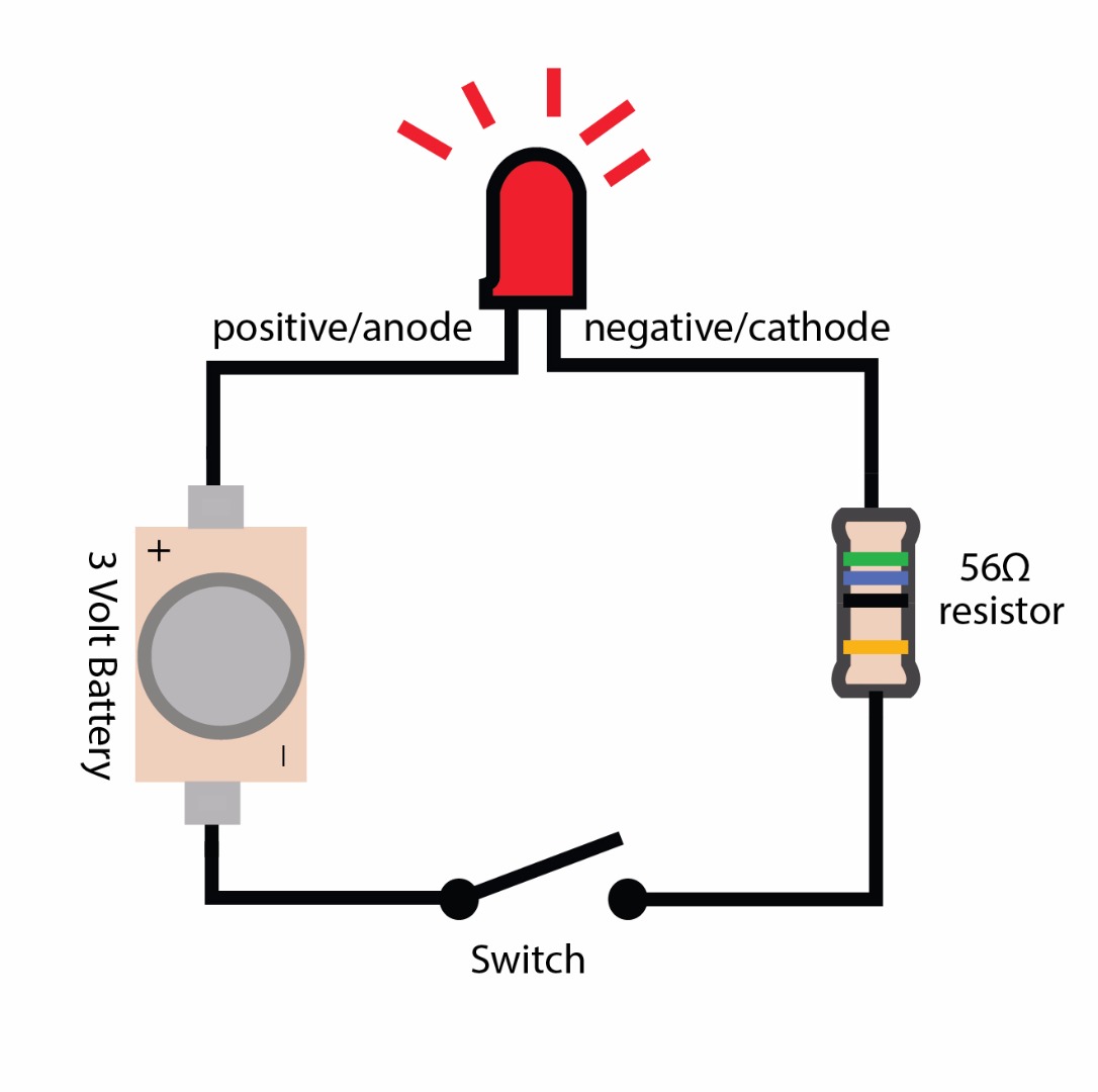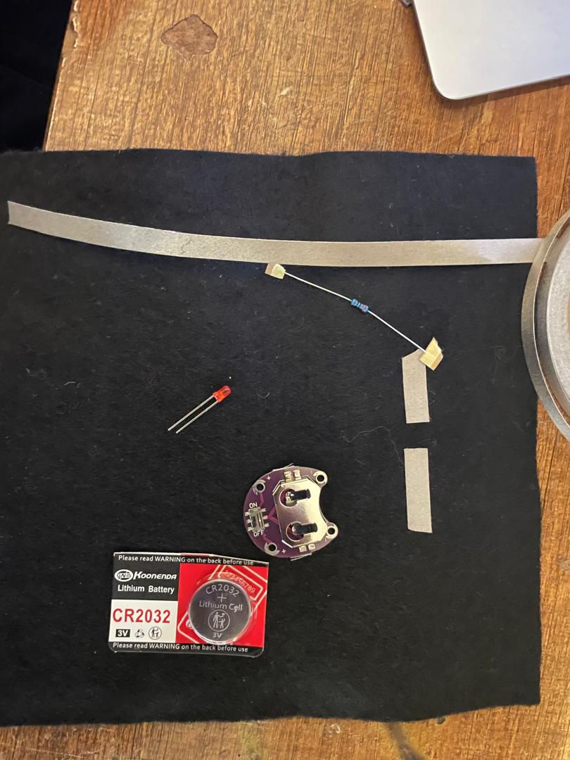 In this circuit you use conductive fabric to build traces, a resistor and a switch. If you made a pressure sensor in the previous steps using velostat or resistive fabric, put that in place of the resistor. When pressed, the LED will dim, instead of turn on and off. I used a fabric resistor in the photo, listed below is a common carbon resistor. Use that if you don't have any resistive material
