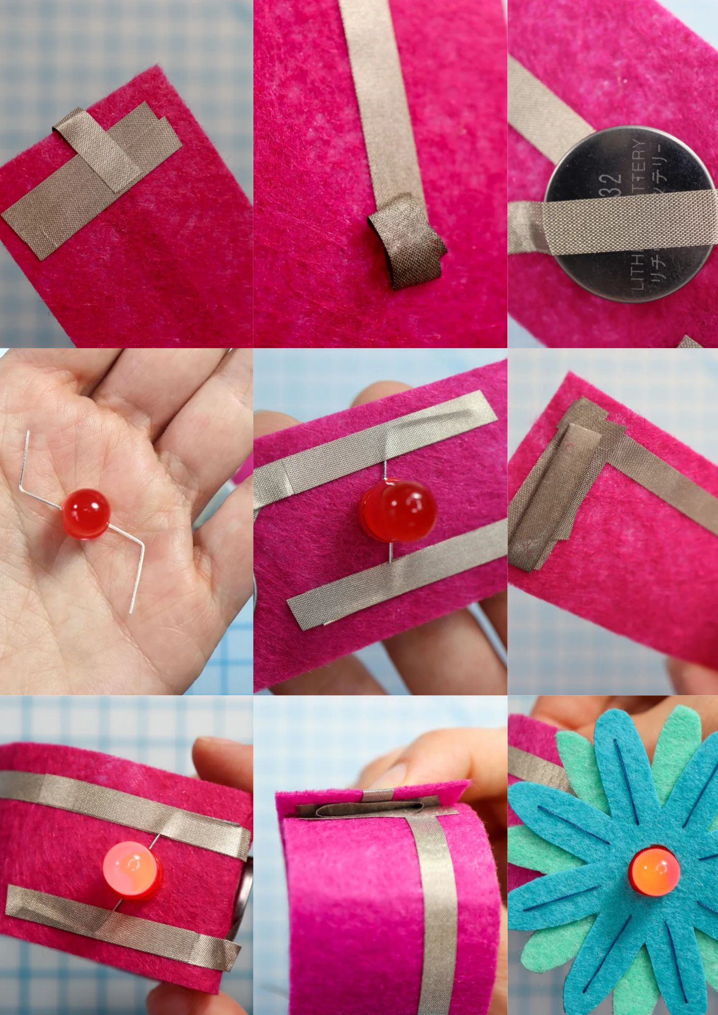 Conductive Thread / Crazy Circuits Method: This is the more durable way to make a wearable light-up circuit and has been the standard way of crafting "soft circuits" for a long time. This method is perfect for students who are interested in, or already know how to sew. By incorporating metal snaps to close the bracelet, the project is durable enough to be worn over and over and over again.