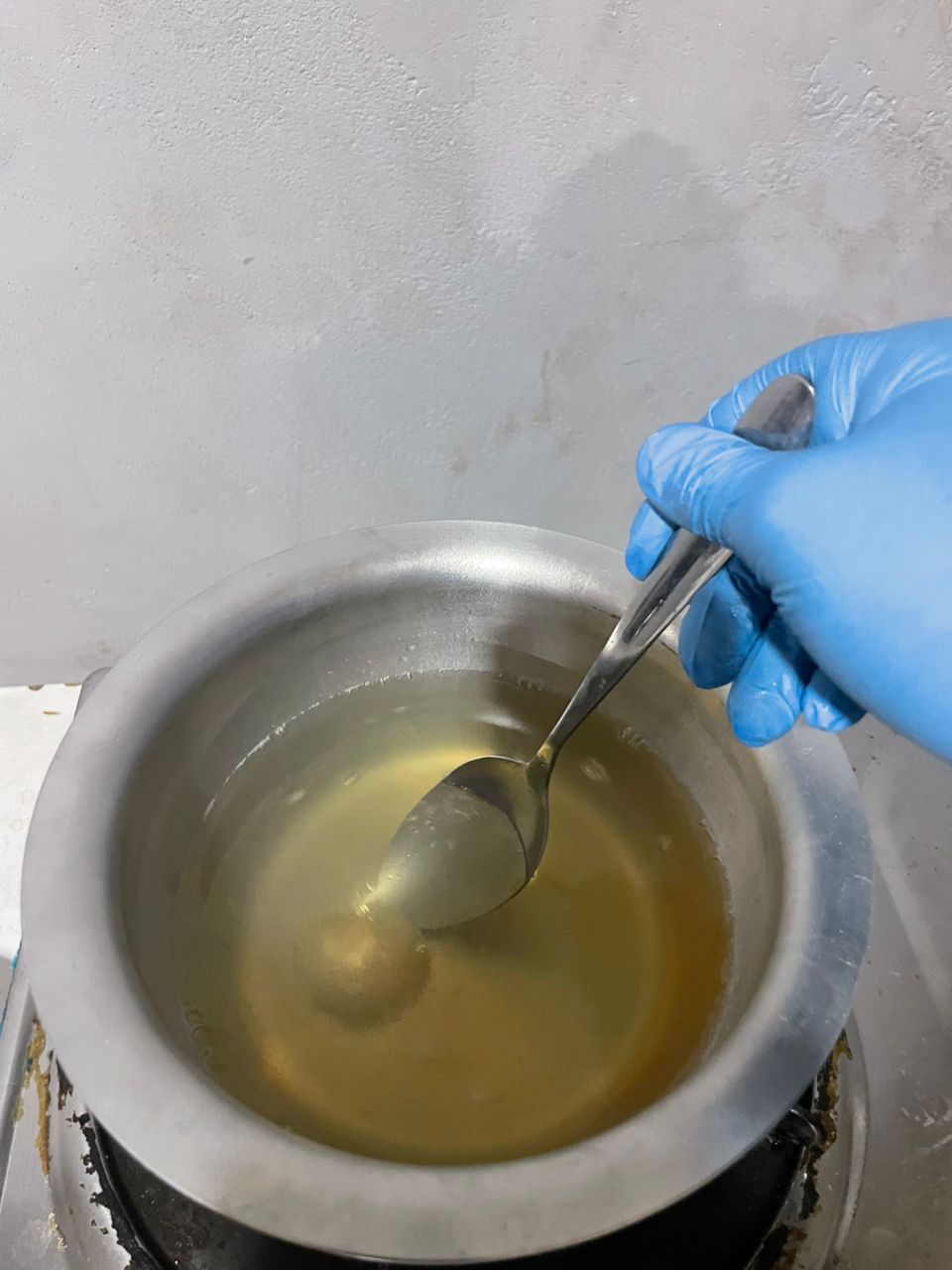 Heat 400 ml of water (not boiling — around 60–70°C). Add the bloomed gelatin and stir continuously until it fully dissolves and forms a clear liquid.