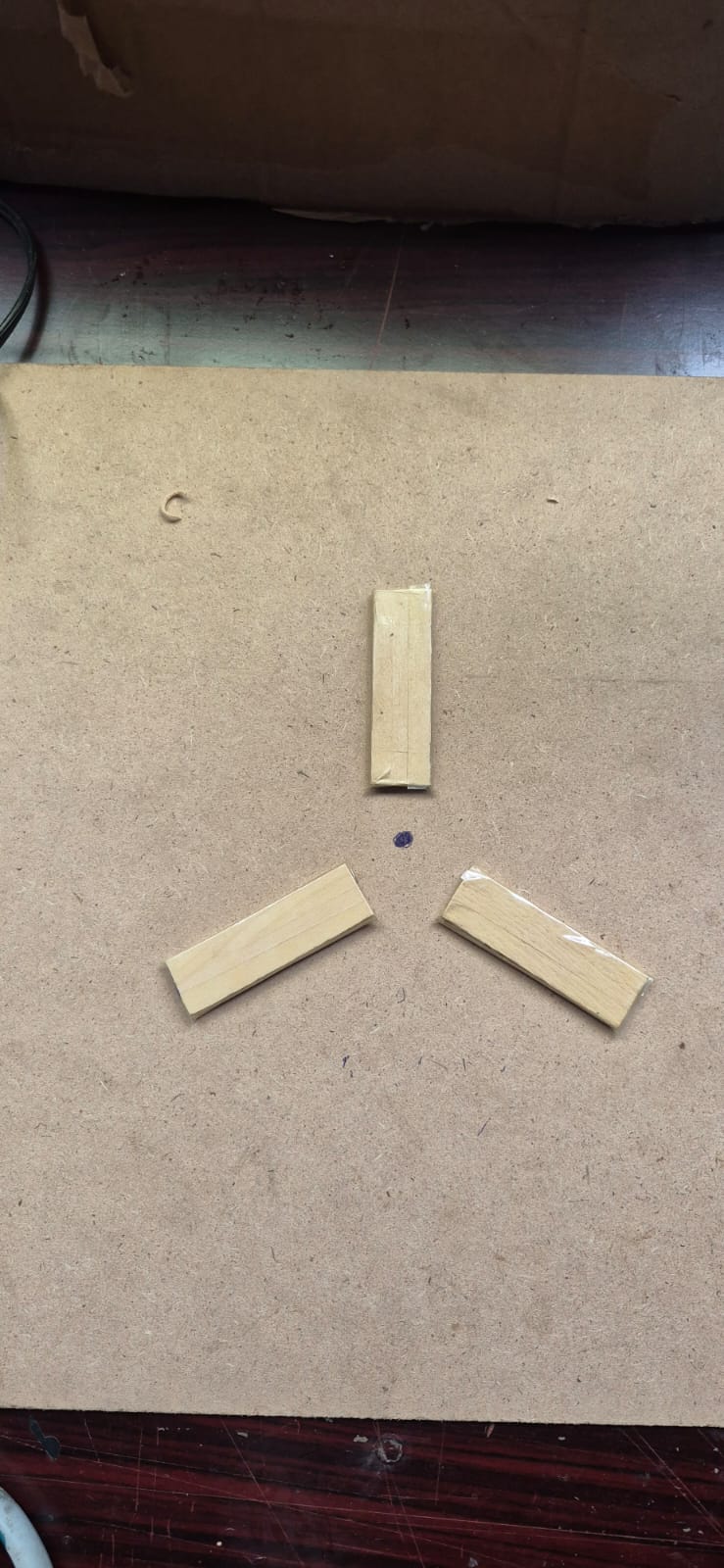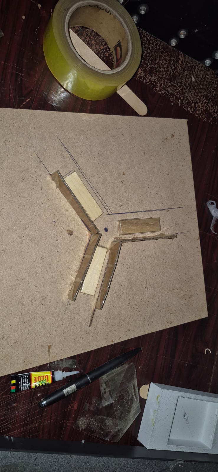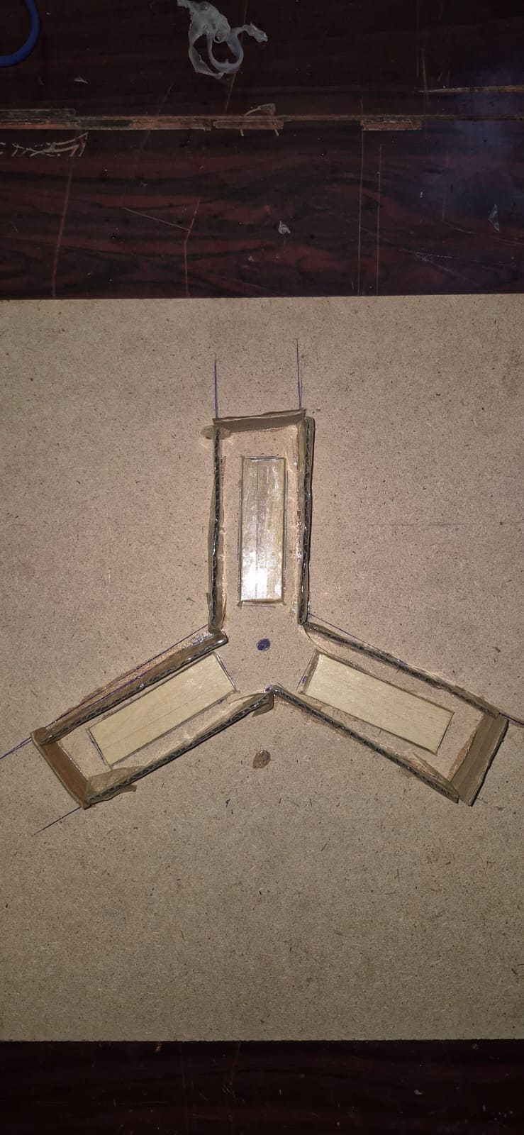 Take one of the 9" x 9" pieces of cardboard and draw a dot in the center. Place each of the blocks so that they radiate outwards at approximately 120 degree angles with the center-most face spaced 3/4" from the center dot. Spread a thin layer of hot glue over the edges of the tape for a smooth finish. Repeat with the remaining 2.5" x 0.5" pieces of cardboard to make two additional blocks.