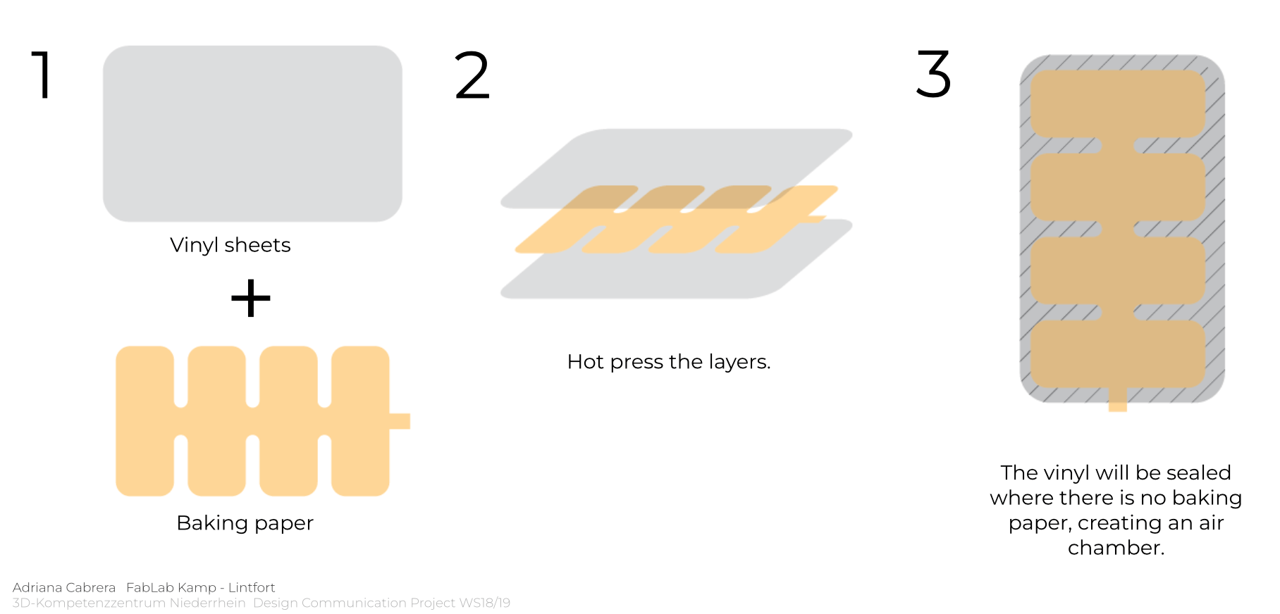The heat press vinyl soft robotics actuator is created by layering two sheets of heat-activated vinyl with a baking paper stencil placed in between to form air channels. When pressed under heat, the vinyl layers fuse everywhere except where the baking paper blocks contact, leaving hollow paths for air. Once the baking paper is removed, these channels become inflatable pockets. Air is then pumped through a small tube inserted at one end, causing the sealed vinyl structure to expand and bend according to the air channel pattern.