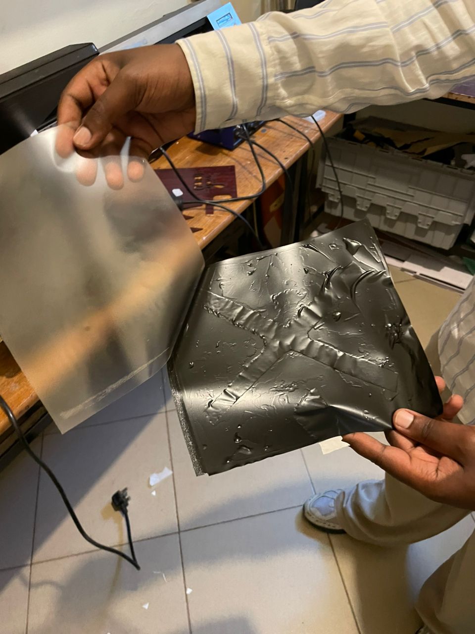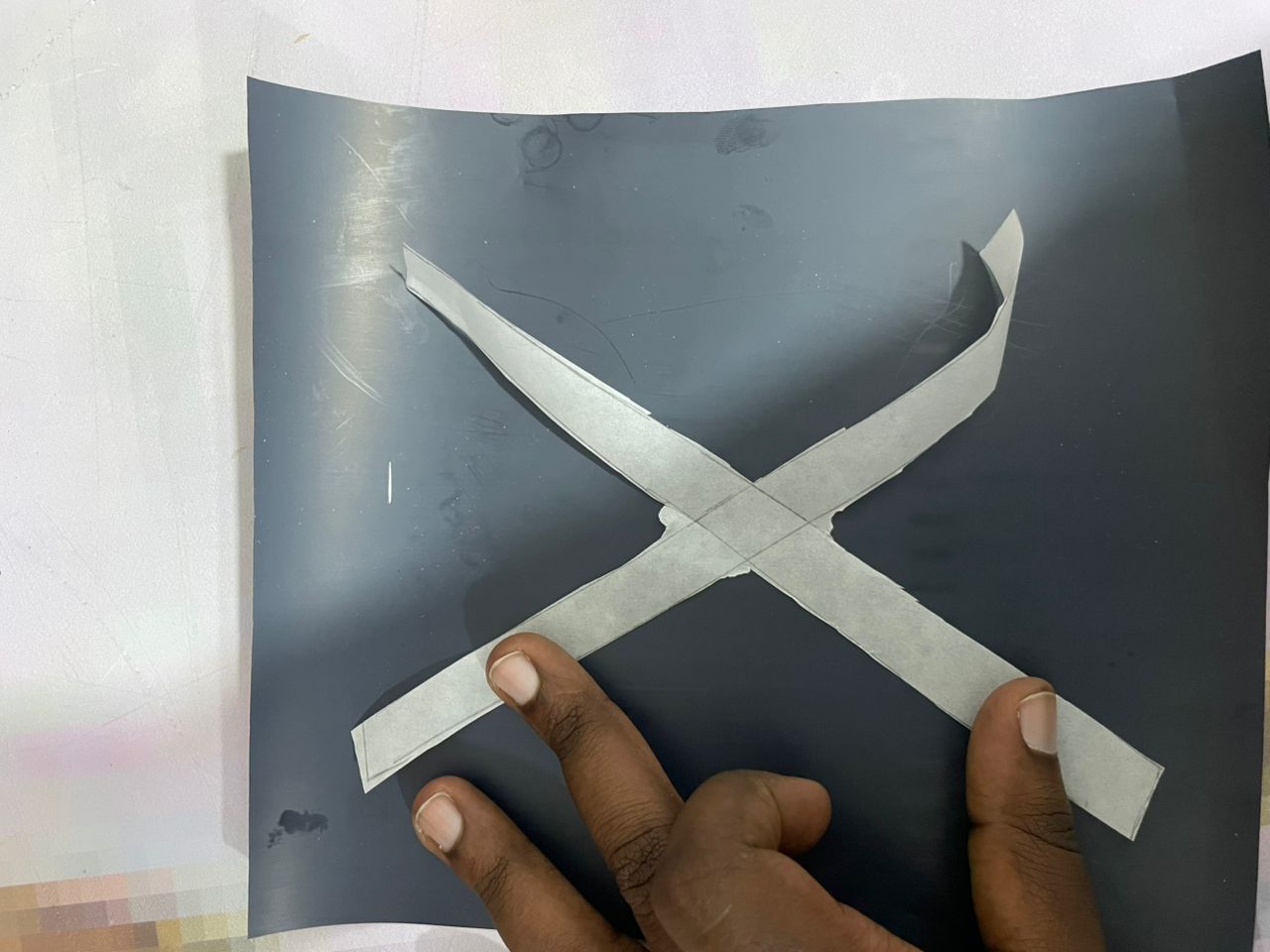 For my first inflatable prototype, I designed an X-shaped structure. The process began by cutting the shape from baking paper, which served as the base layer. I then applied a sheet of heat transfer vinyl (HTV) on top of the baking paper and sealed the layers together using a heat press machine to create the air-tight seams. Once the pressing process was complete, I peeled off the plastic carrier film from the vinyl surface. However, one error occurred during fabrication — I forgot to leave an air valve opening, which made it impossible to inflate the structure. This highlighted the importance of planning an air channel or inflation port in the initial design stage for future prototypes.