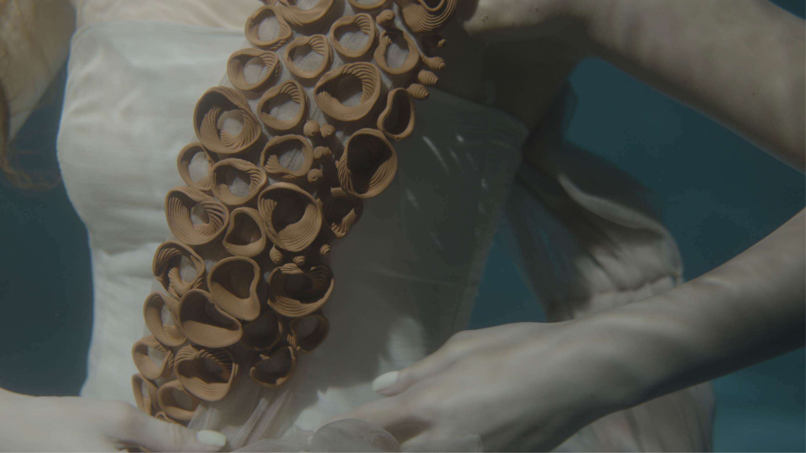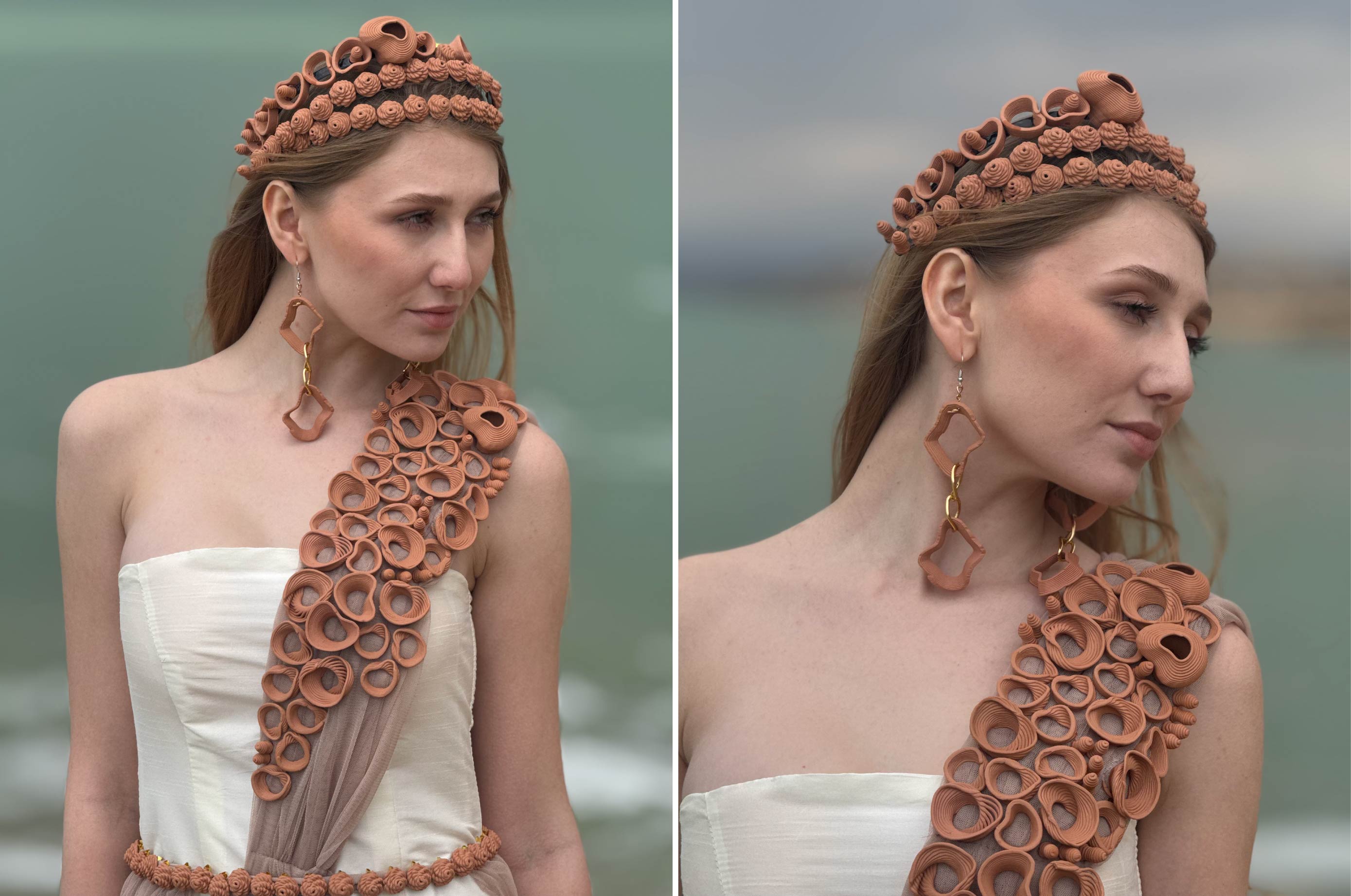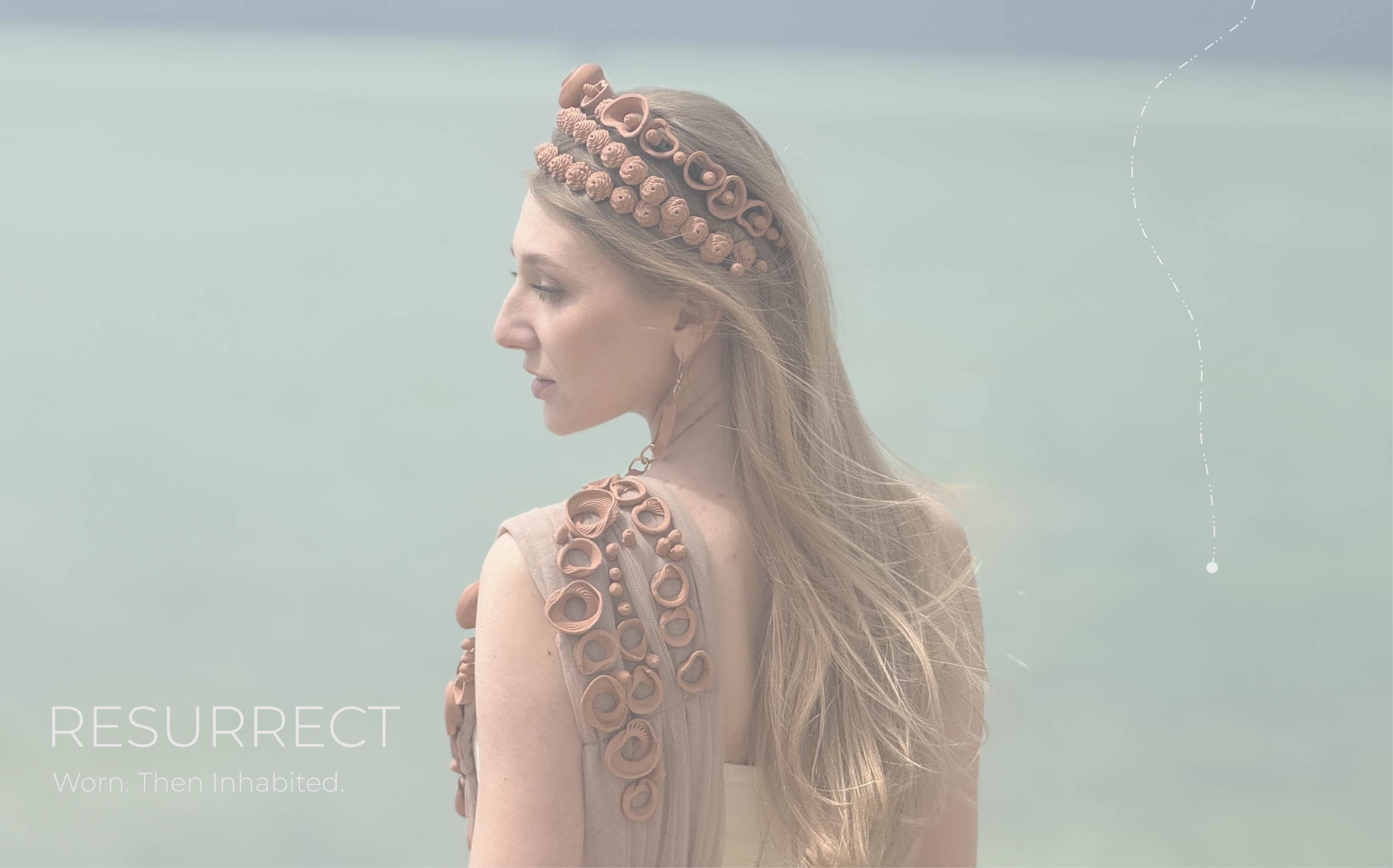 Resurrect is a ritual-based wearable project that questions human hierarchy over nature through a multi-life design approach. 3D-printed terracotta modules reinterpret ornamental fashion through a sustainable lens, worn then inhabited, transitioning from body adornment to marine habitat. Disassembled from the garment and reassembled underwater on a steel scaffold, they transform into an artificial reef ecosystem.