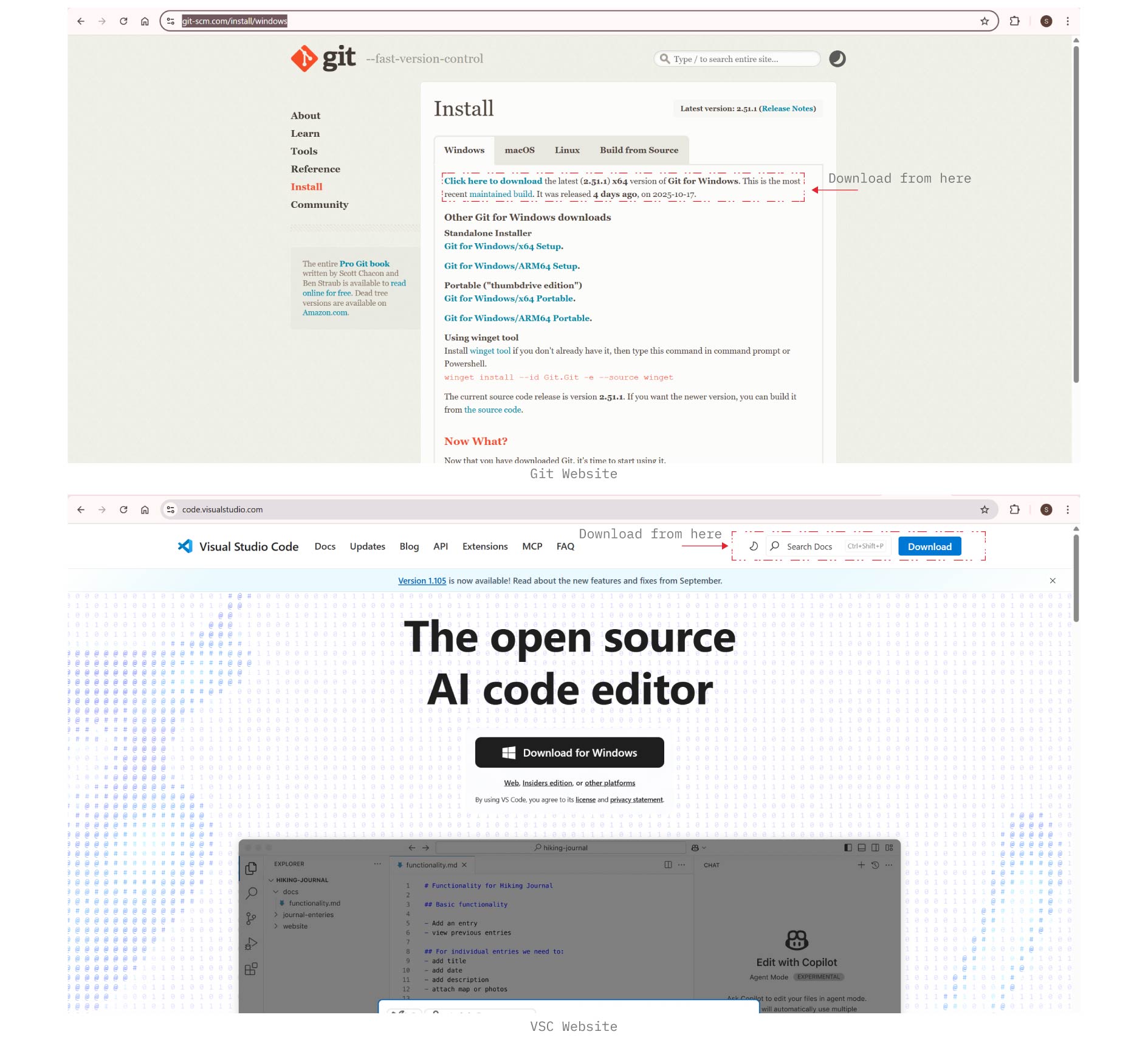 Download Git and Visual Studio Code and Install them on the Desktop.