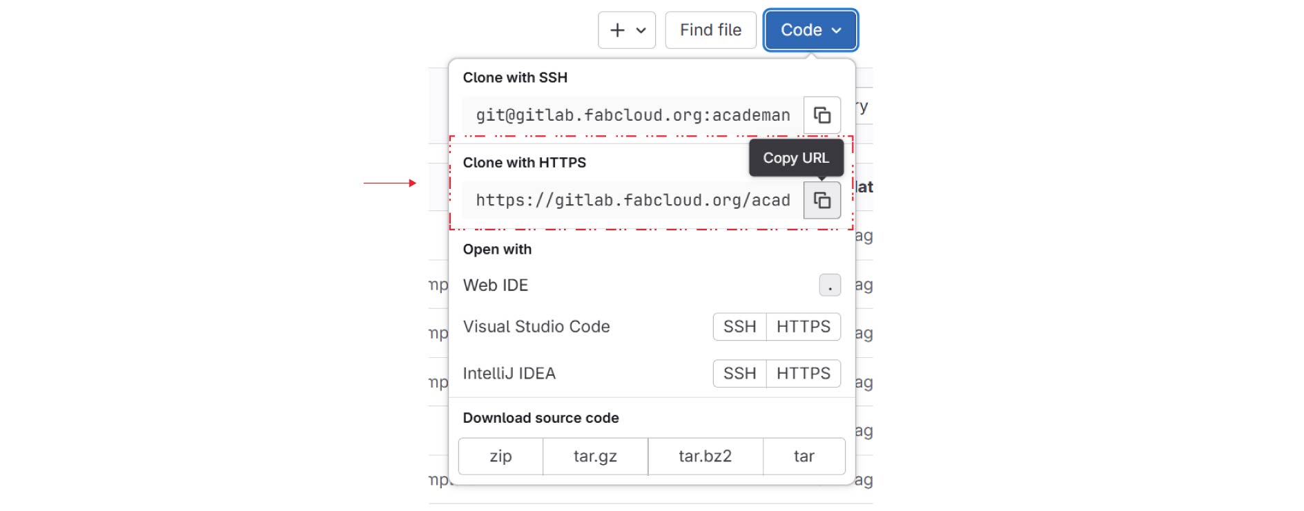 - Click Clone → Copy the HTTPS link (e.g. https://gitlab.fabcloud.org/...).