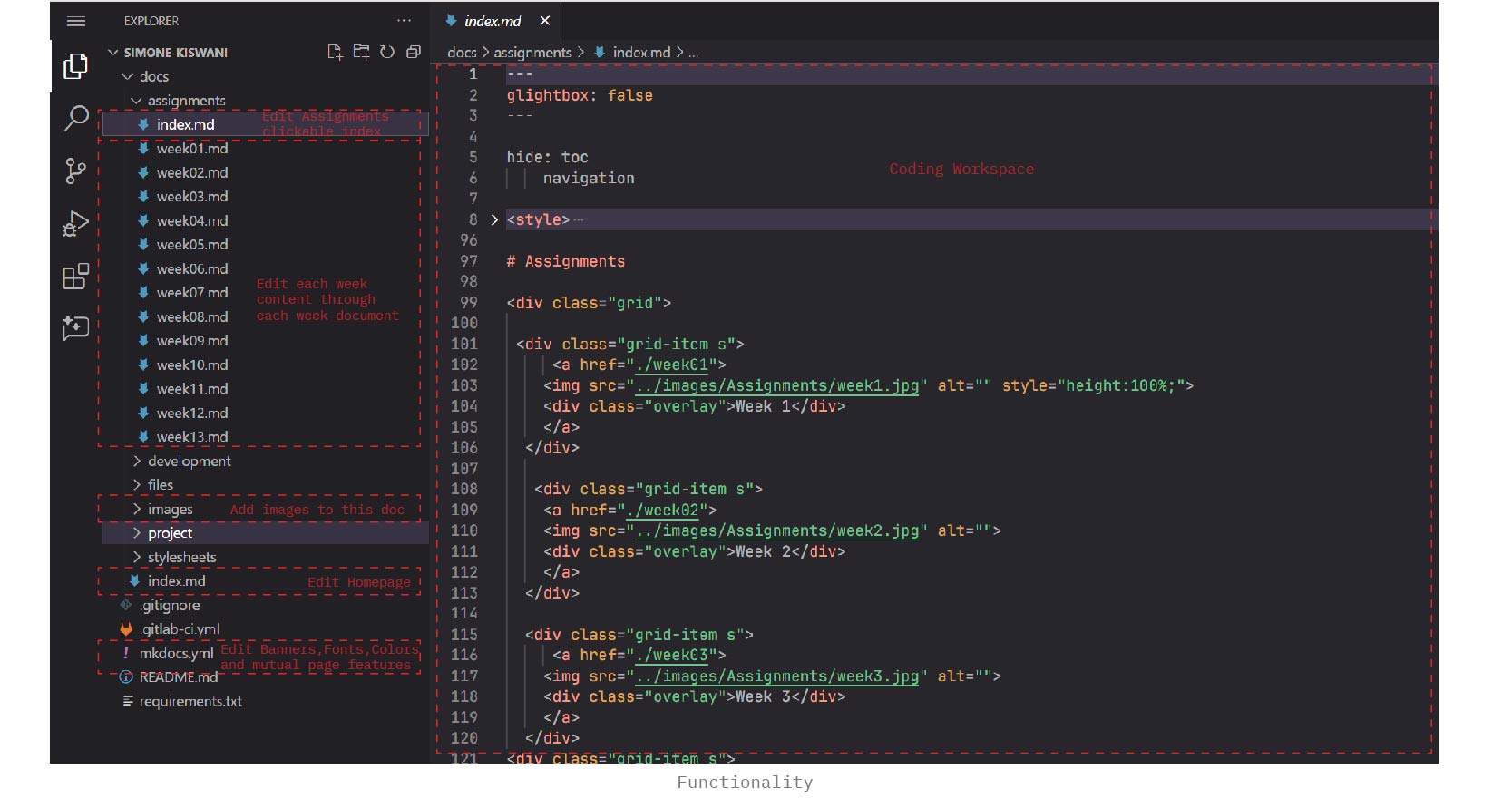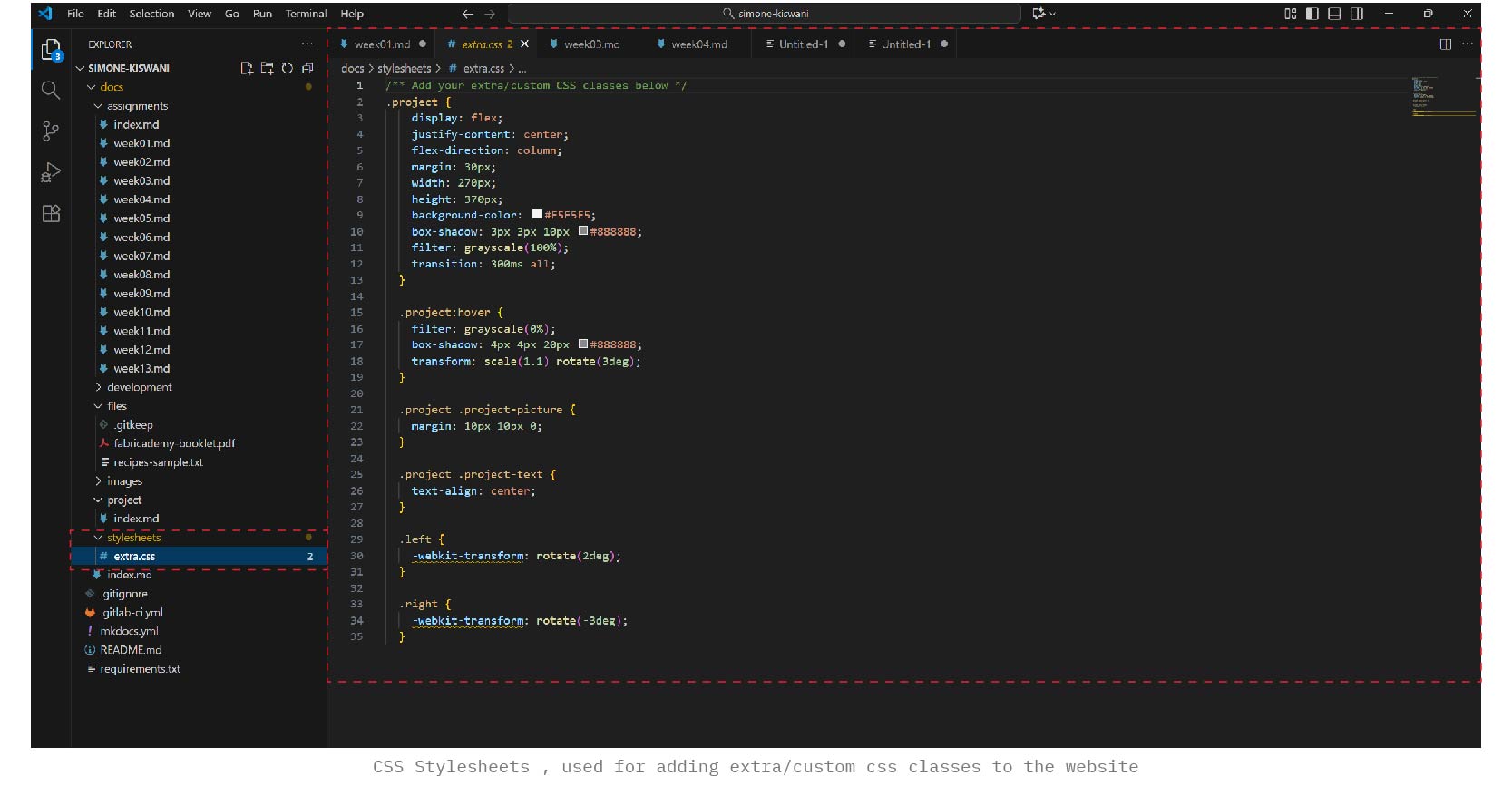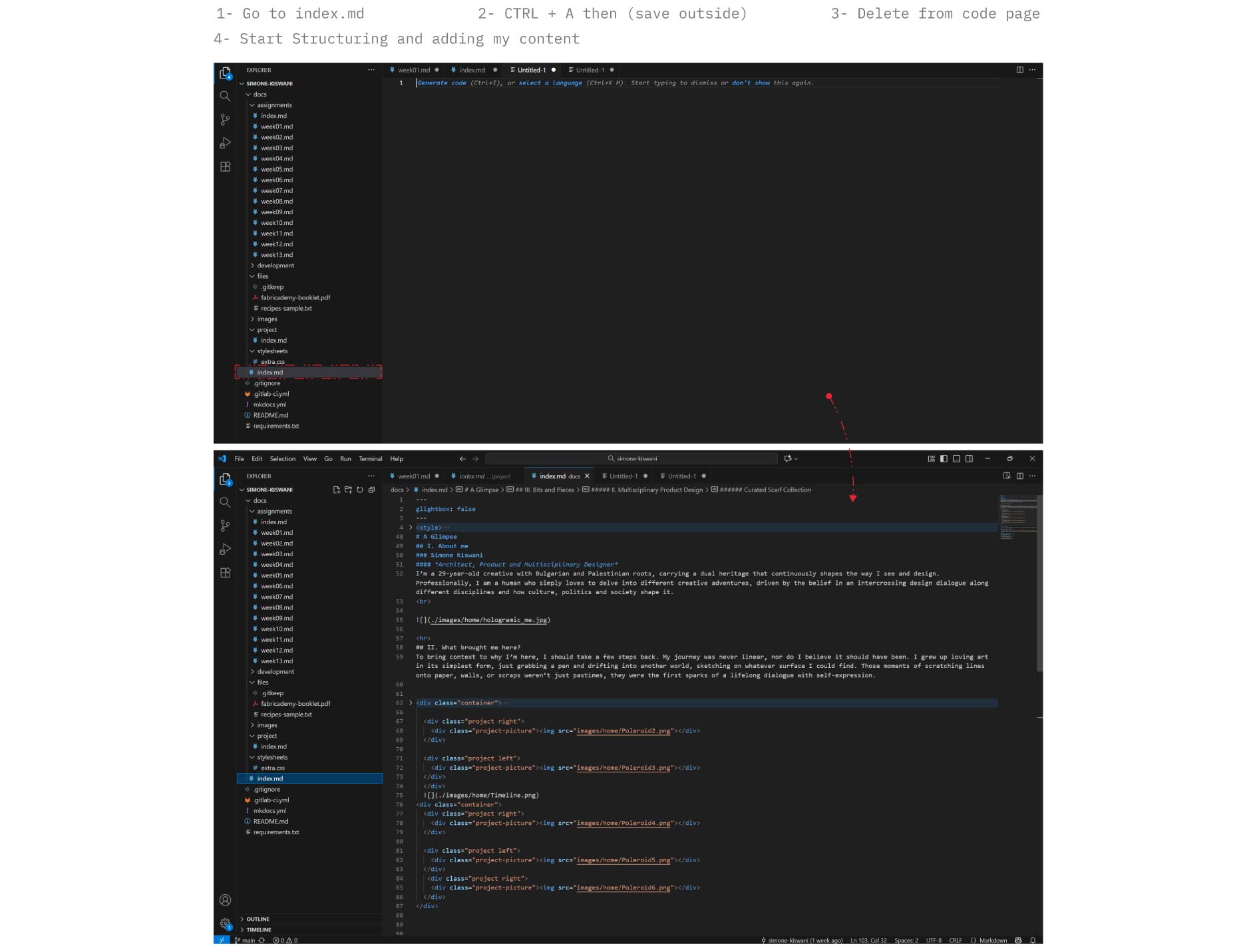After being introduced to coding with Markdown, I was tasked with documenting each week's assignment using Markdown as the main language in addition to html, css and yml. The first week unfolded as follows: