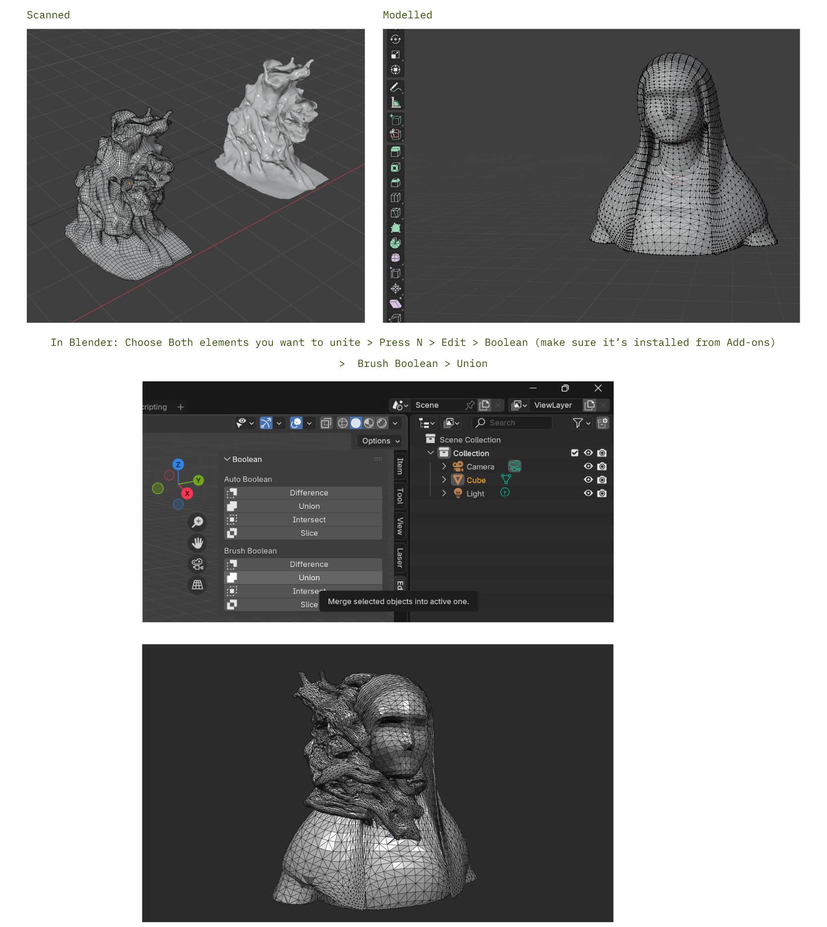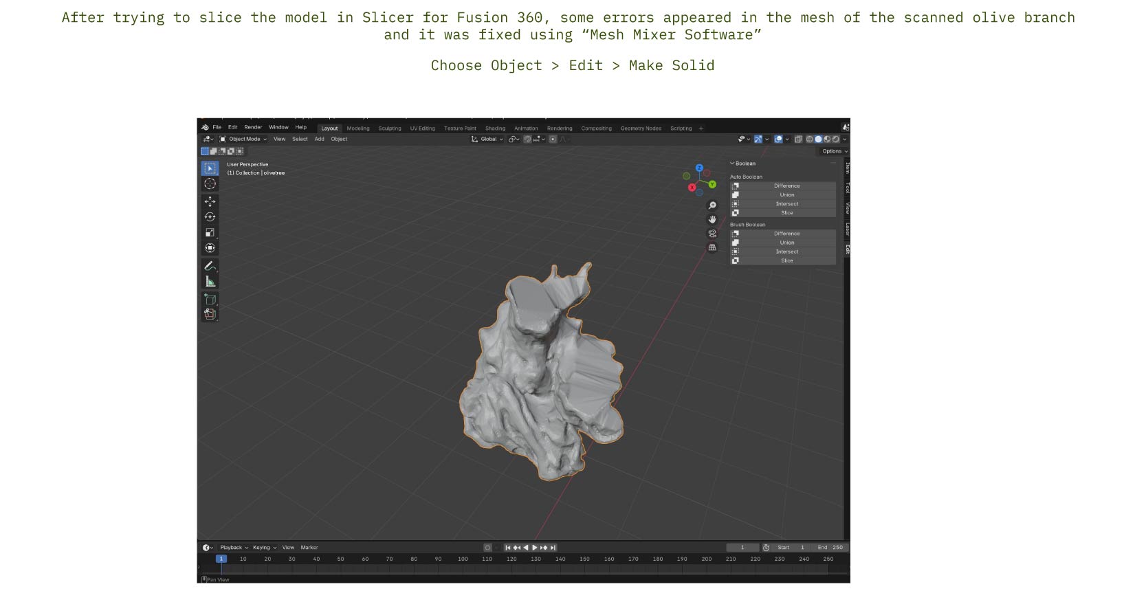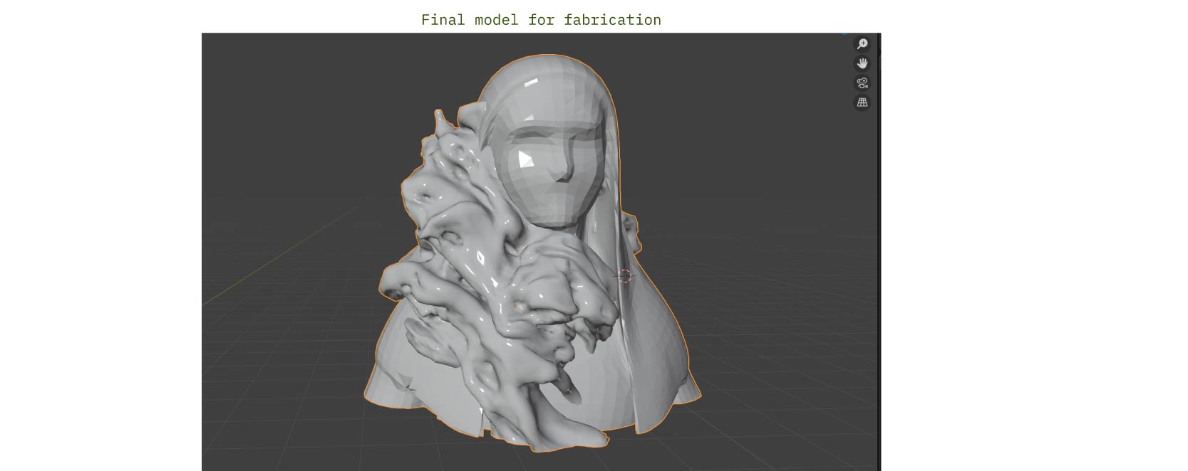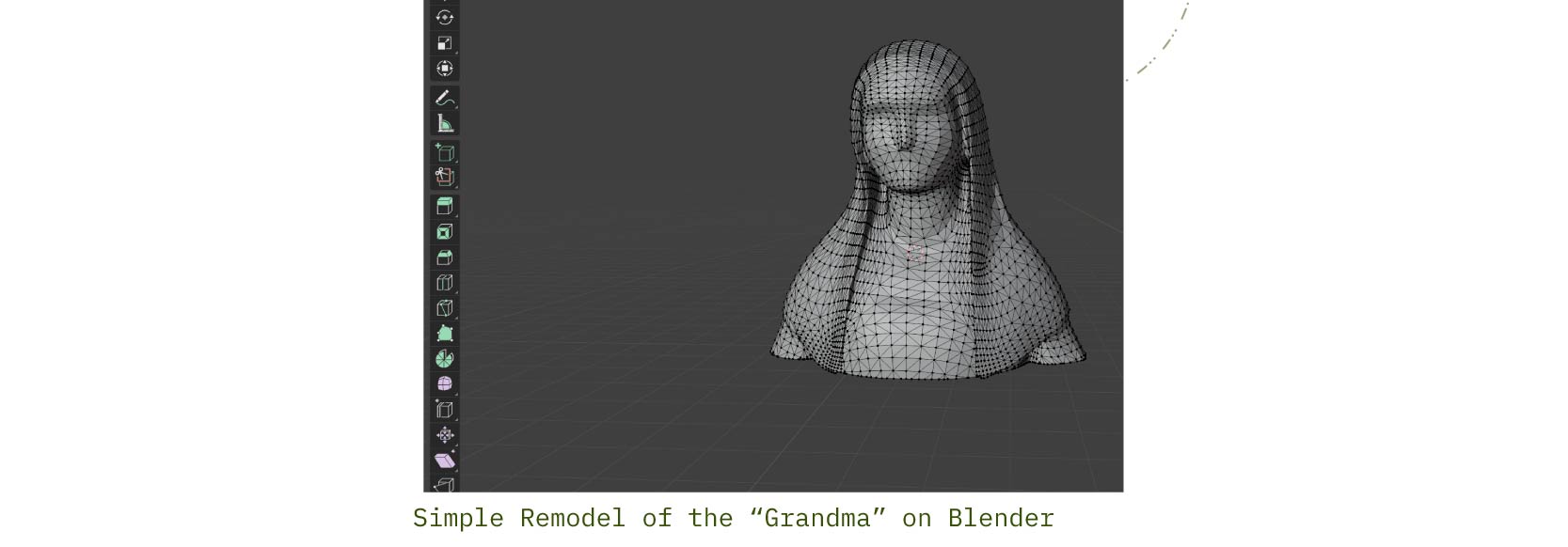 After importing the scanned models of the grandma and the branch into Blender, both meshes were aligned and refined. Using the Boolean modifier, the two elements were unified into a single continuous geometry.