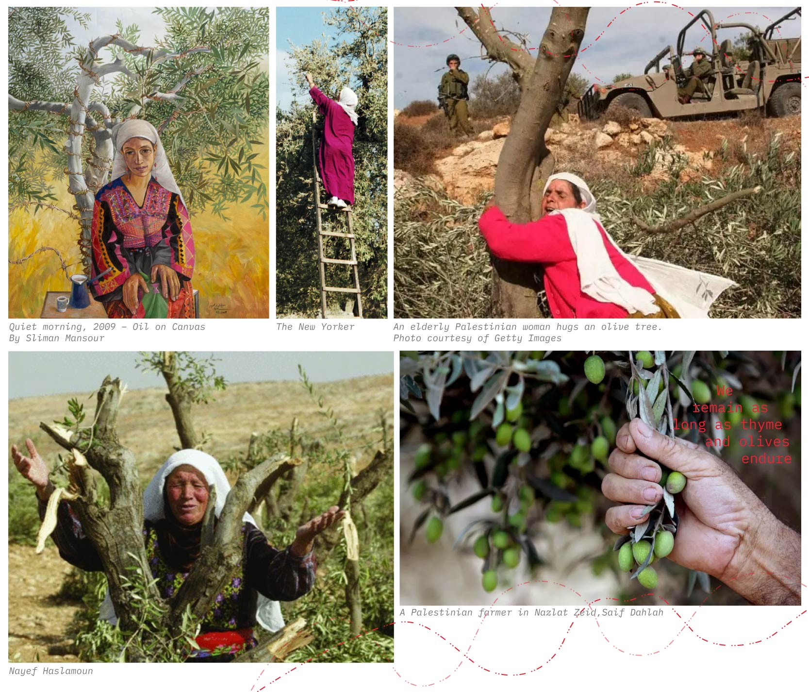 The grandmother represents memory, wisdom, and continuity, her body carrying the weight of lived history and survival. The olive tree, deeply rooted in the land, embodies steadfastness, regeneration, and belonging; it persists through time only to grow again. Together, they embody the renowned saying: "باقون ما بقي الزعتر والزيتون" — “we will remain as long as the zaatar and the olive exist.”
