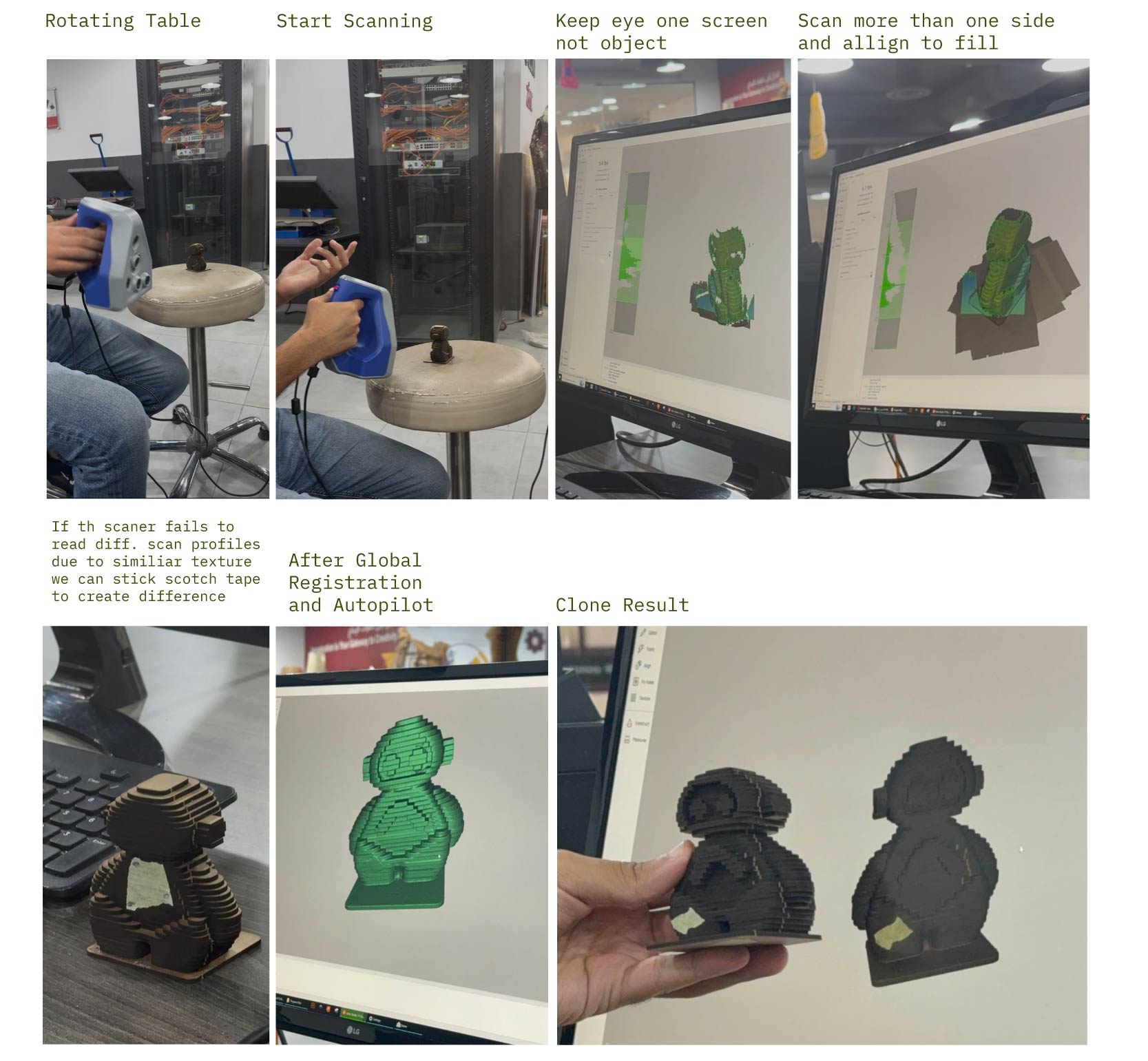 Scanning the Object Hold the scanner approximately 20–30 cm from the object. Begin scanning while moving smoothly around the object, keeping a consistent distance and speed. Cover all sides and angles to avoid missing geometry. Pause and resume scanning if tracking is lost, then continue from the last aligned area.