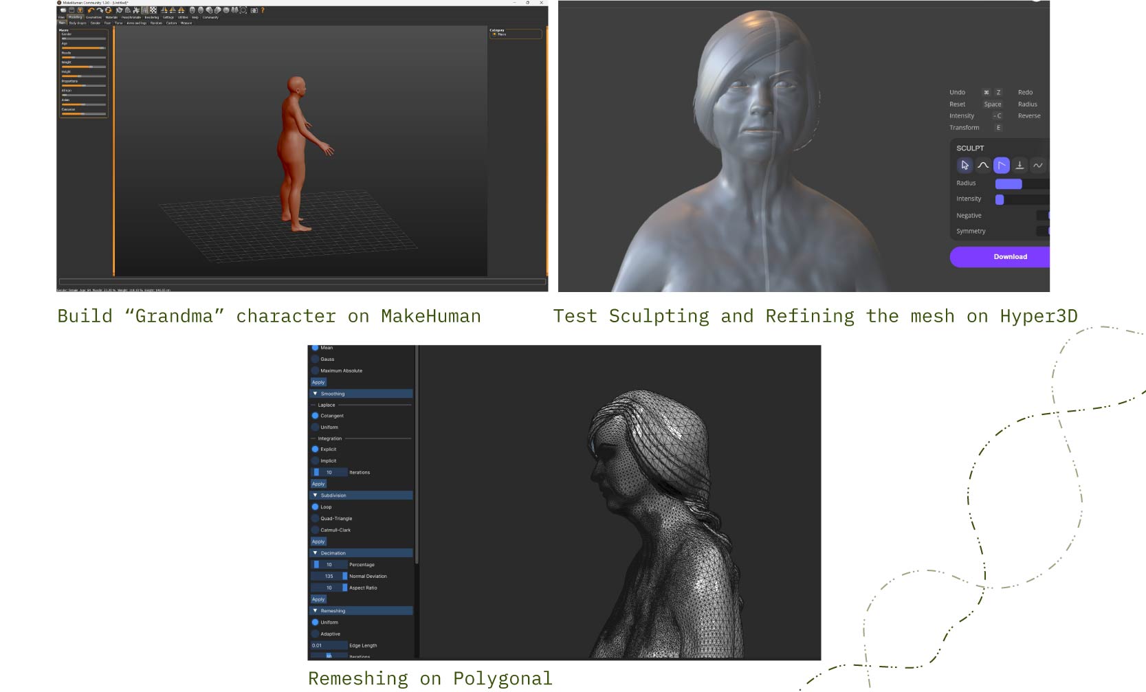 I was interested to learn about new softwares and add-ons like MakeHuman and explore it, It has so many amazing features that enable you to develop human models with simple click. My initial plan was to create the “Grandma” character through this platform, but I encountered some complexities with the head model I generated. As a result, I decided to shift towards Blender and develop a simpler character there, allowing me more control and flexibility in shaping the figure.