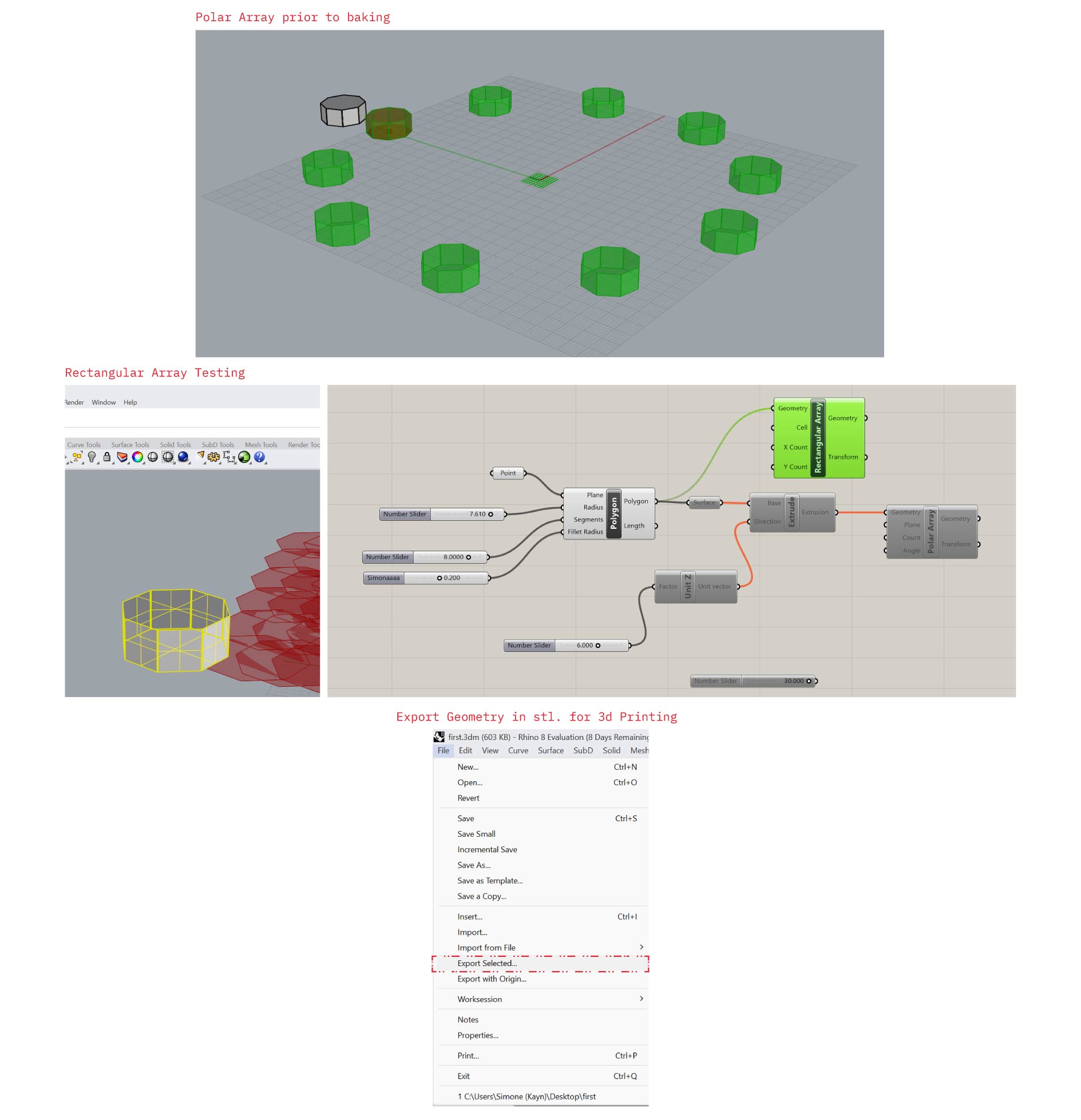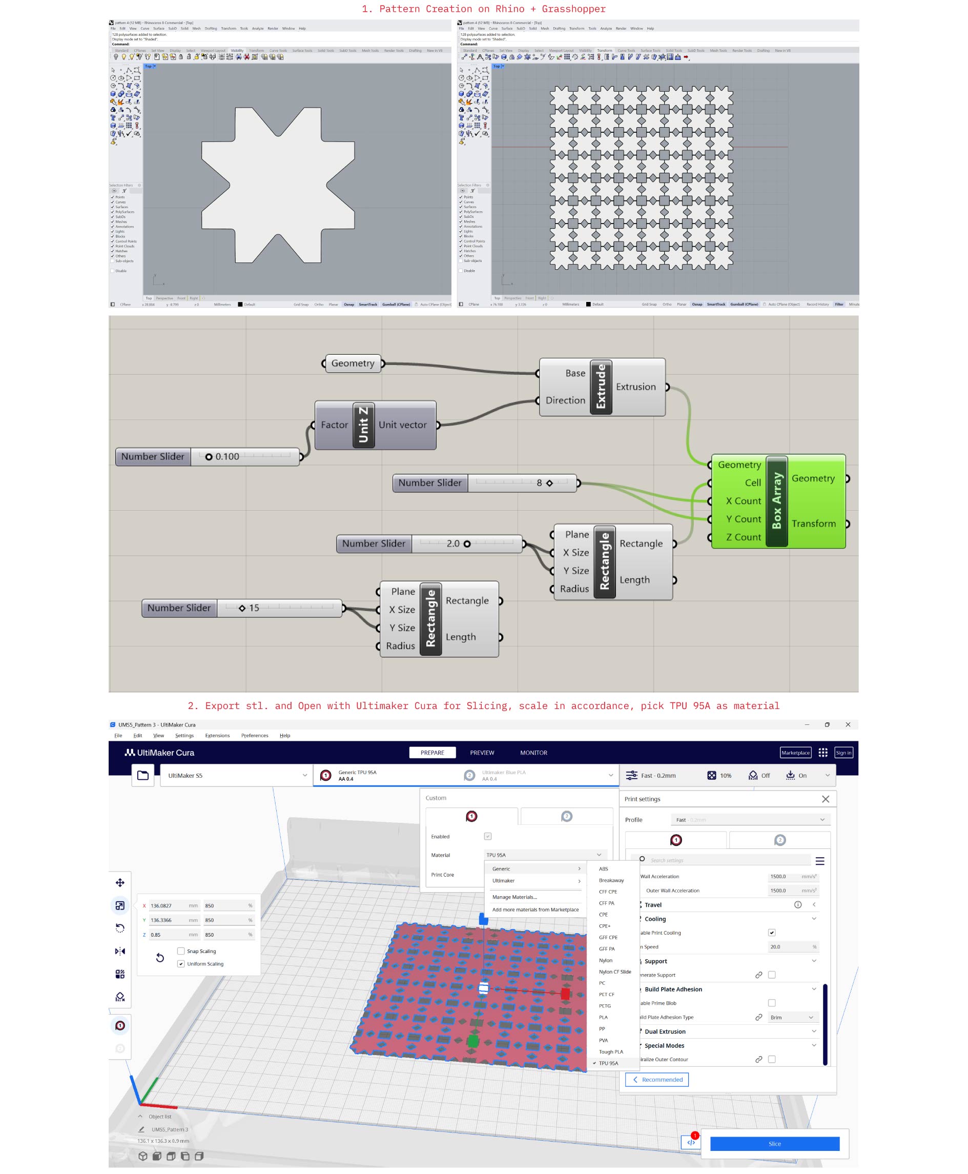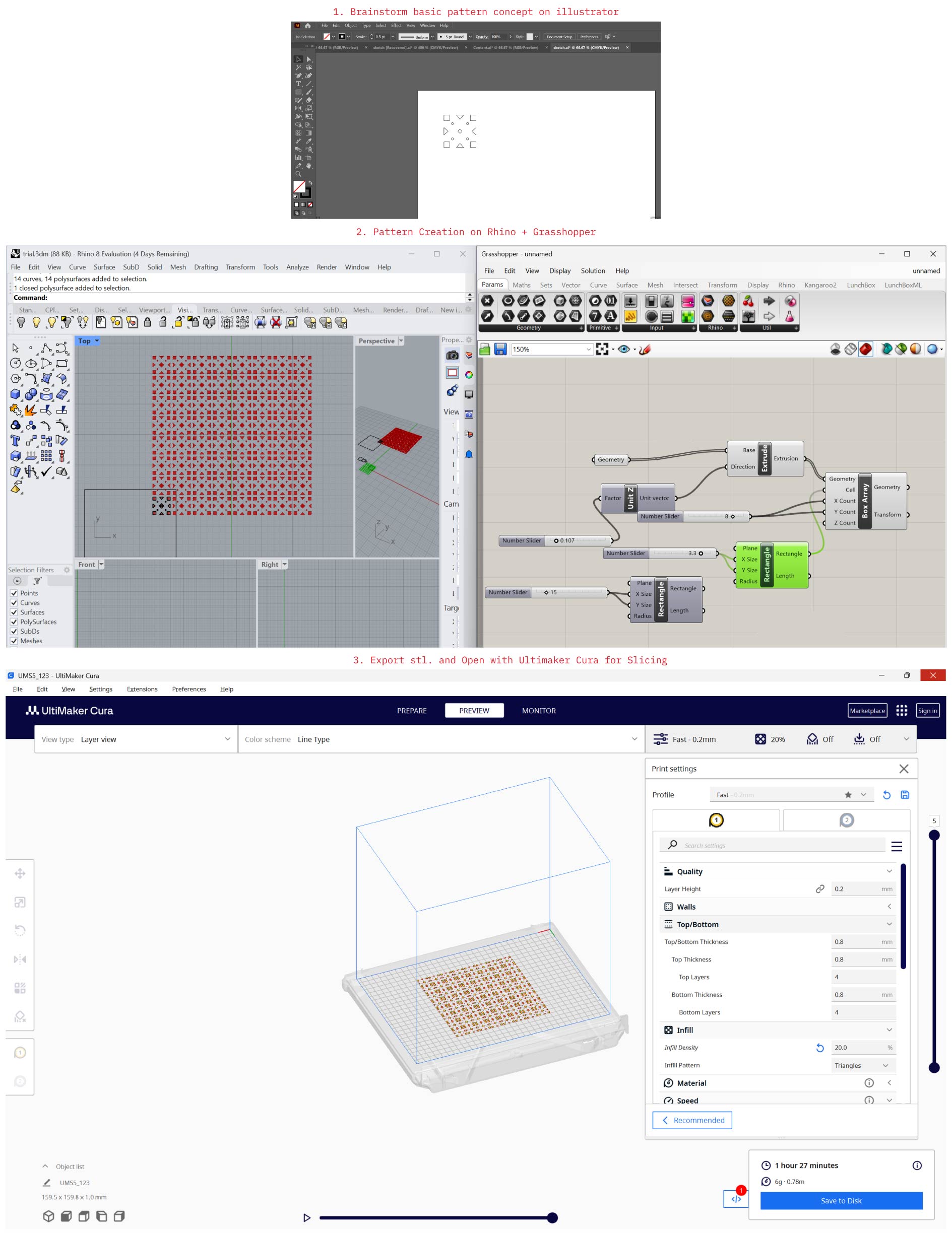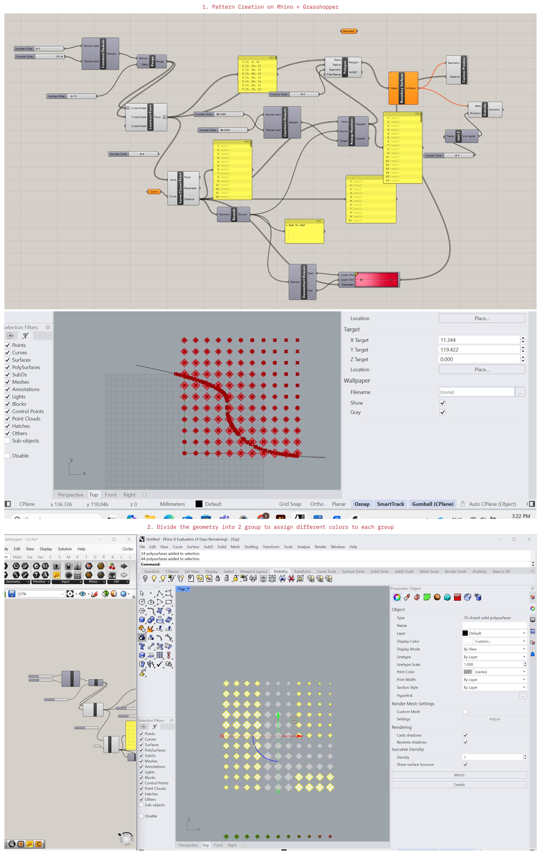 Rhino provides full control over geometry creation and modification, while Grasshopper acts as a visual programming environment that drives this geometry through parameters and logic. Changes are made instantly and non-destructively, allowing iterative design and rapid testing, accordingly we can use it for complex pattern exploration and generation of fabrication-ready outputs.