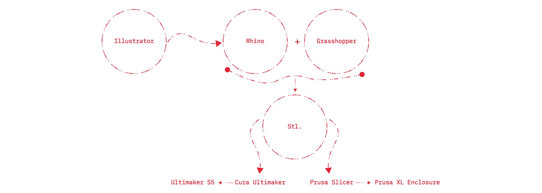 After exporting the geometry from Rhino as an STL file, we open it in a 3D slicer that matches the printer being used. In my case, I worked with the Ultimaker S5 and the Prusa XL Enclosure, so I prepared separate workflows based on the requirements of each machine.
