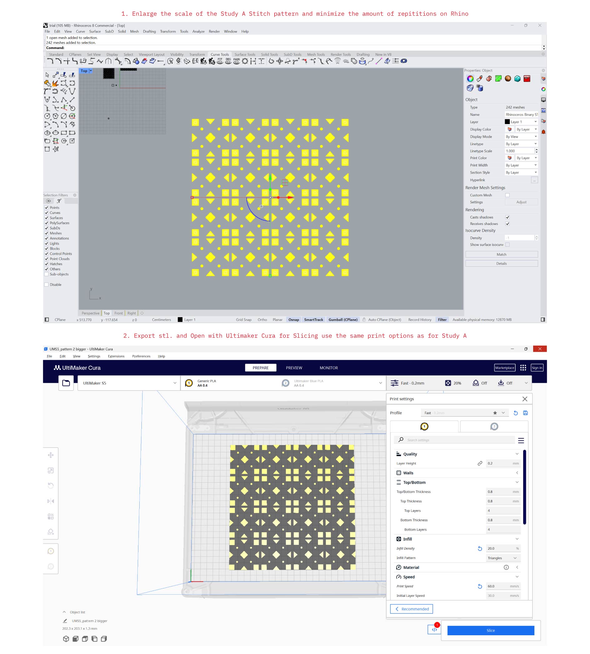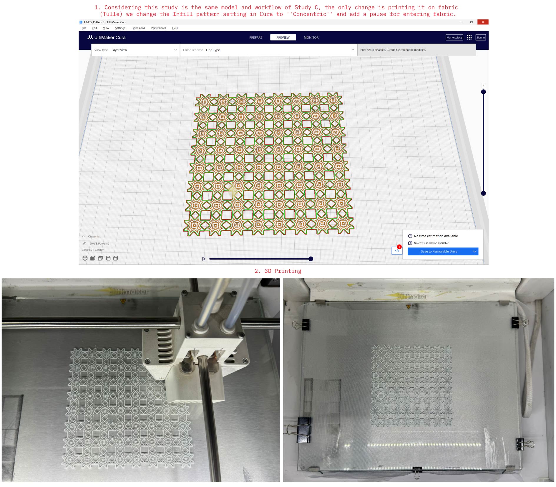 In this study I went with same workflow and setting of Study C, except for printing it on fabric and changing the Infill pattern in Cura to ''Concentric''.