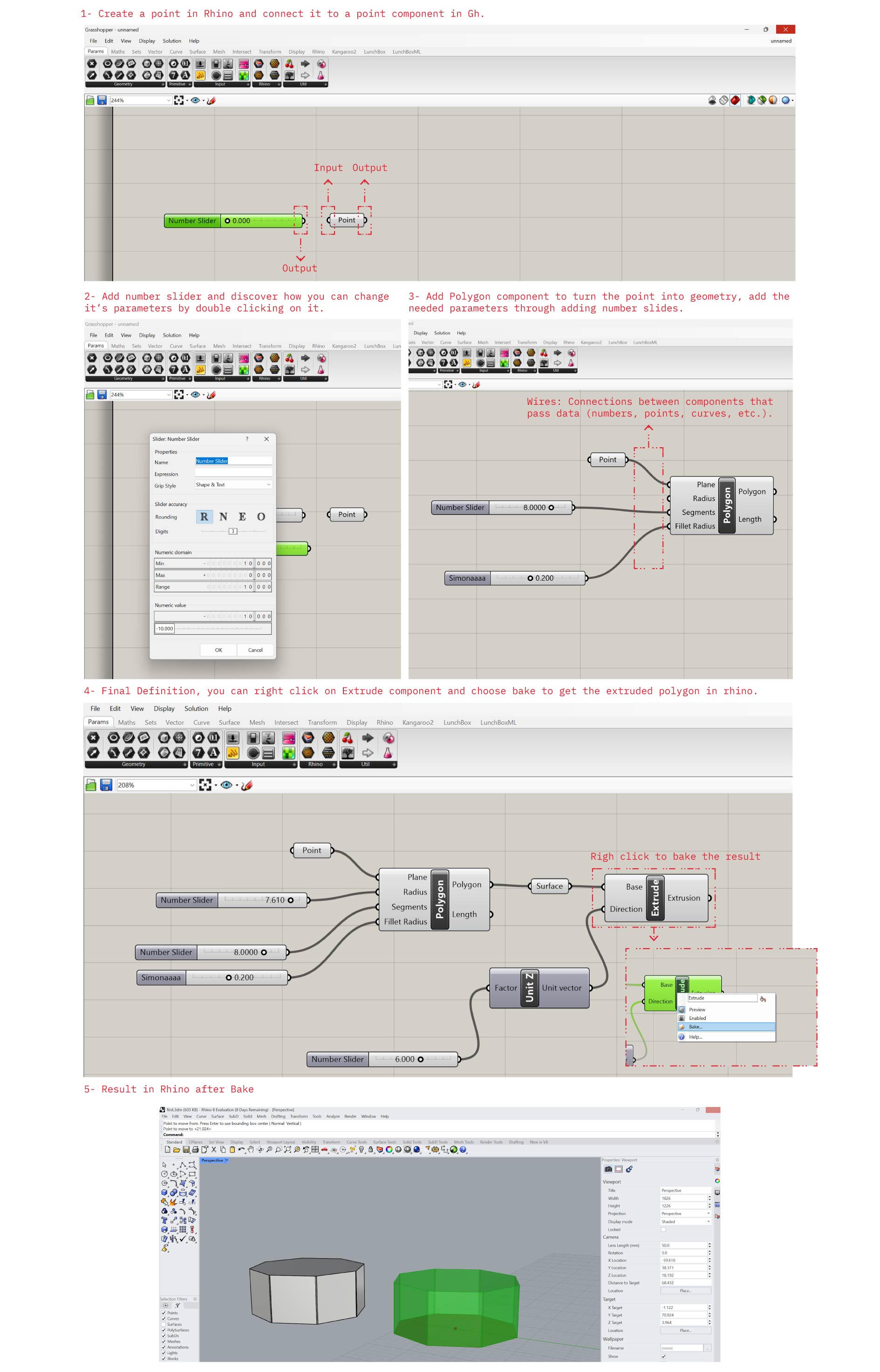 Preview and bake: Right-click > Bake to convert Grasshopper output into real Rhino geometry.