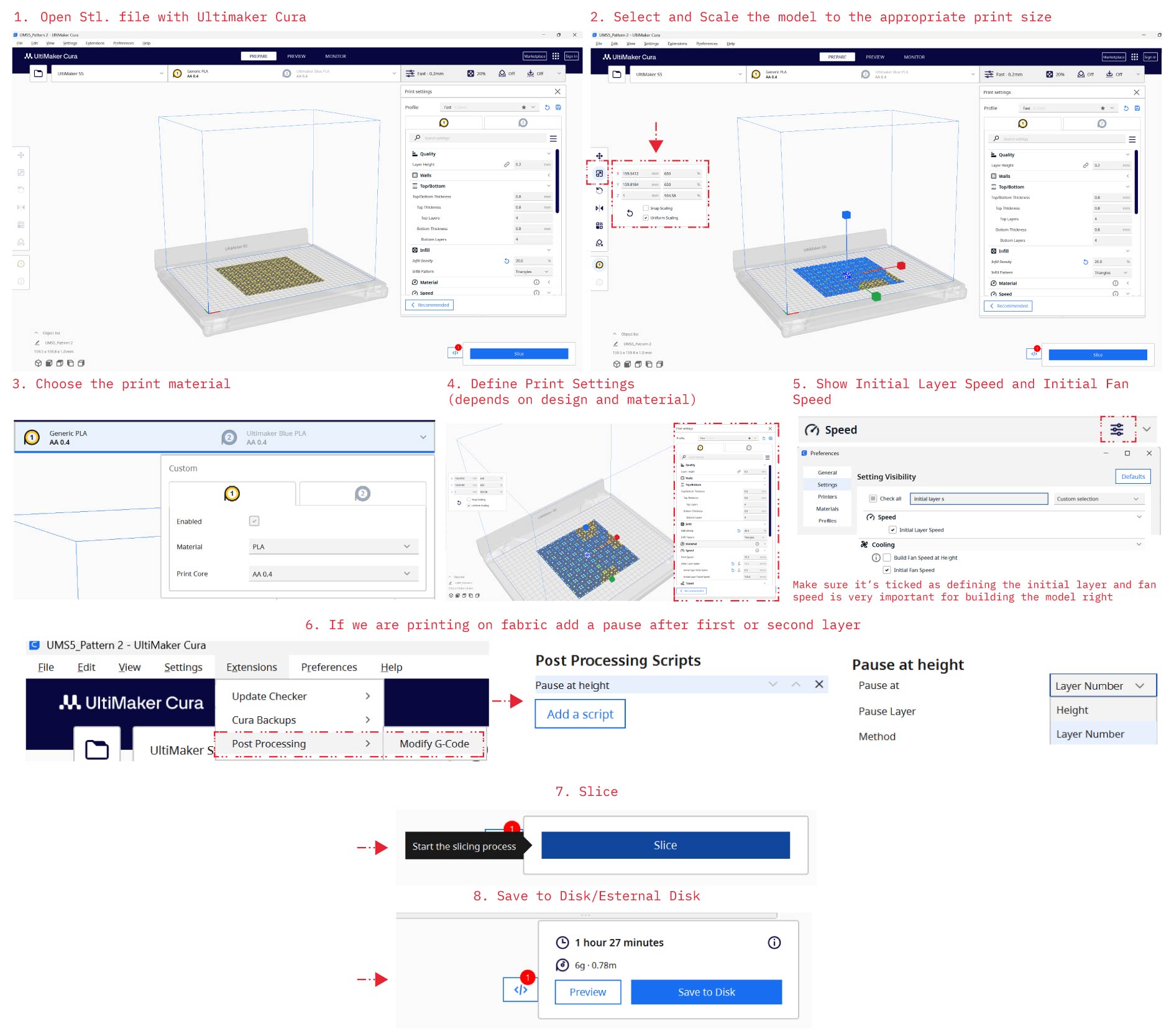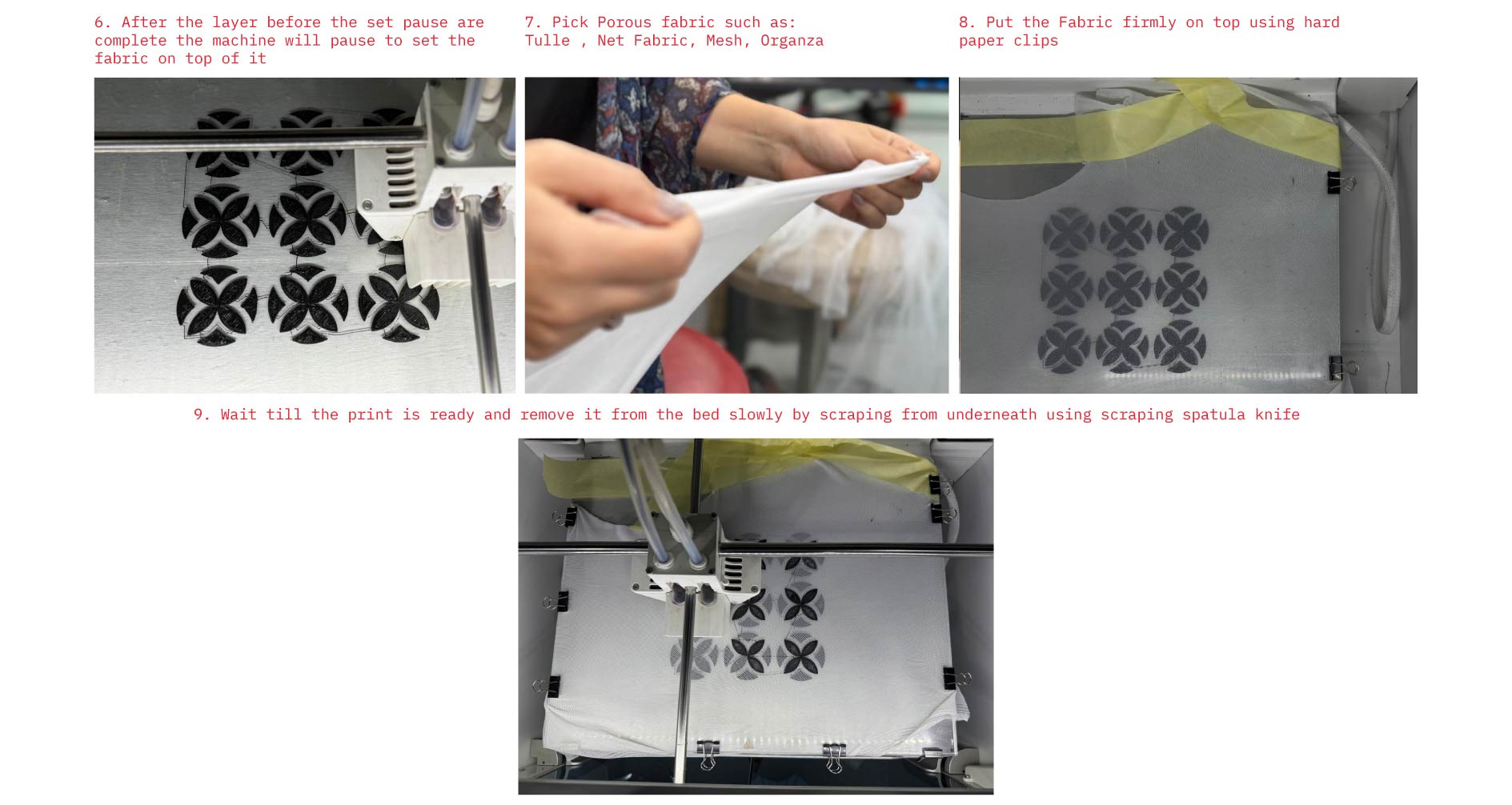 - If we are printing on fabric we should make sure a pause happens after first or second layer in order to adjust the fabric above the first printed layer,assuring material bond on the fabric