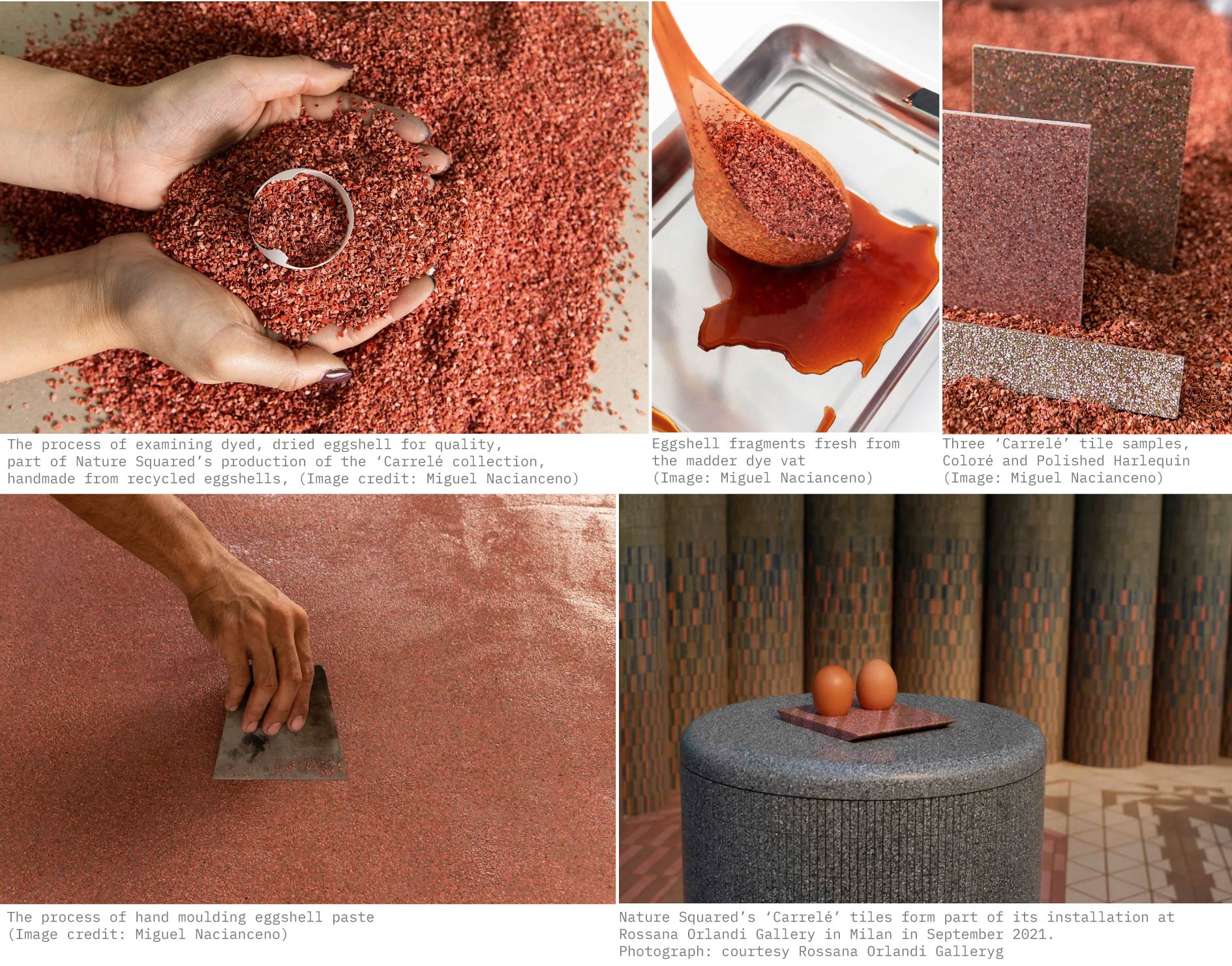 One particularly interesting example of biomaterial fabrication I came across is Carrelé, an ecologically sustainable collection of wall tiles created by Nature Squared. Every year, around 250,000 tonnes of chicken eggshell waste are generated worldwide, most of which ends up in landfills. In response, Carrelé transforms this overlooked waste into beautifully handcrafted wall tiles, showcased as part of an installation at the Rossana Orlandi Gallery in Milan.