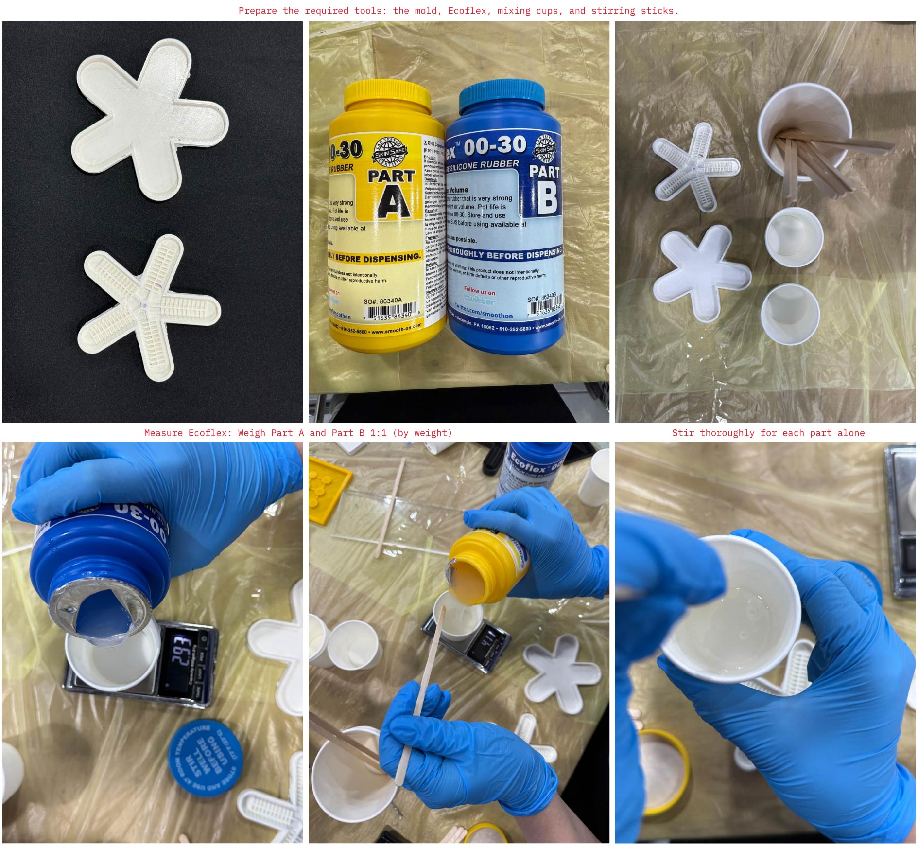 Step 4: Measure Ecoflex: Weigh Part A and Part B 1:1 (by weight), per the datasheet.