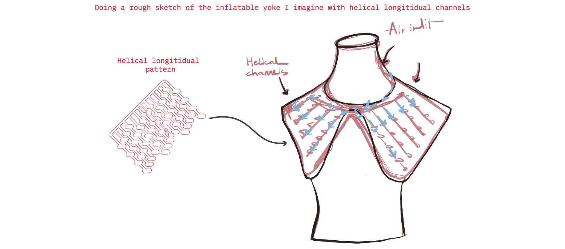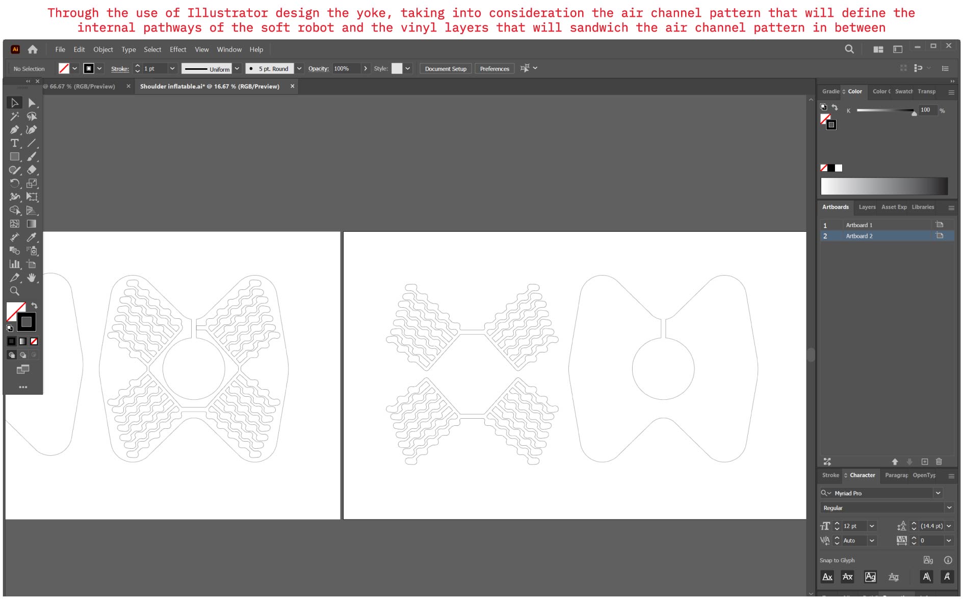 Heat pressing vinyl and baking paper was hands down my favorite technique for creating soft robots! In this experiment I aimed to create an inflatable yoke that mimics helical fiber movement. The process began with a simple sketch, followed by a more measured design developed in Illustrator from which PDF files were exported to cut both the vinyl and the baking paper.