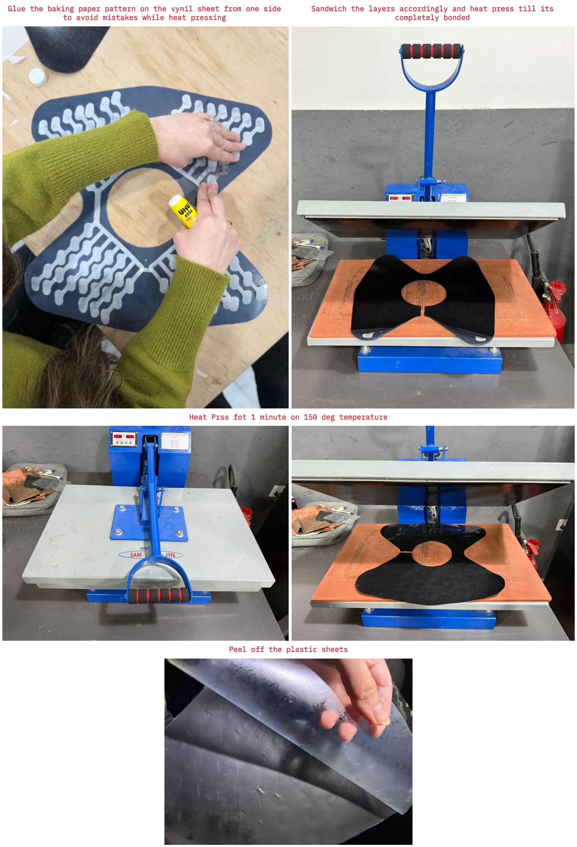 Step 4: Heat press the layers: Set the heat press to the appropriate temperature (150 degrees) and time (1 minute) for the vinyl material. Apply heat and pressure evenly to fuse the vinyl layers together. During pressing, the vinyl bonds everywhere except where the baking paper blocks contact between the two layers. This prevents sealing in those areas and forms hollow air channels.