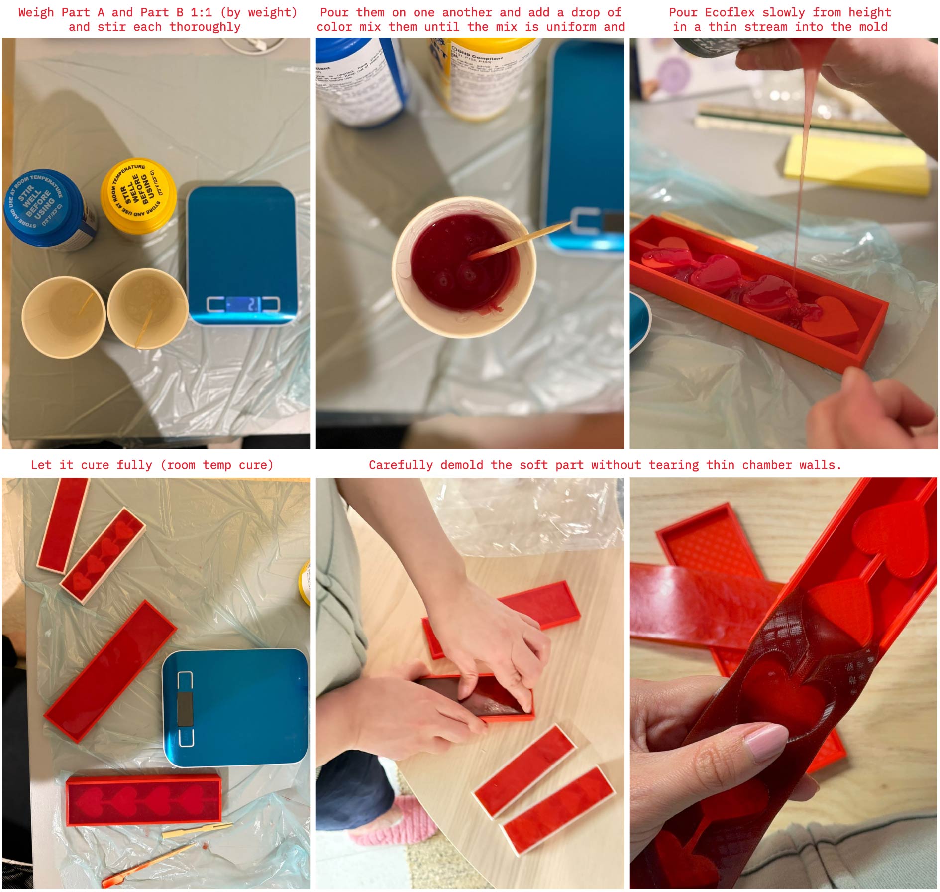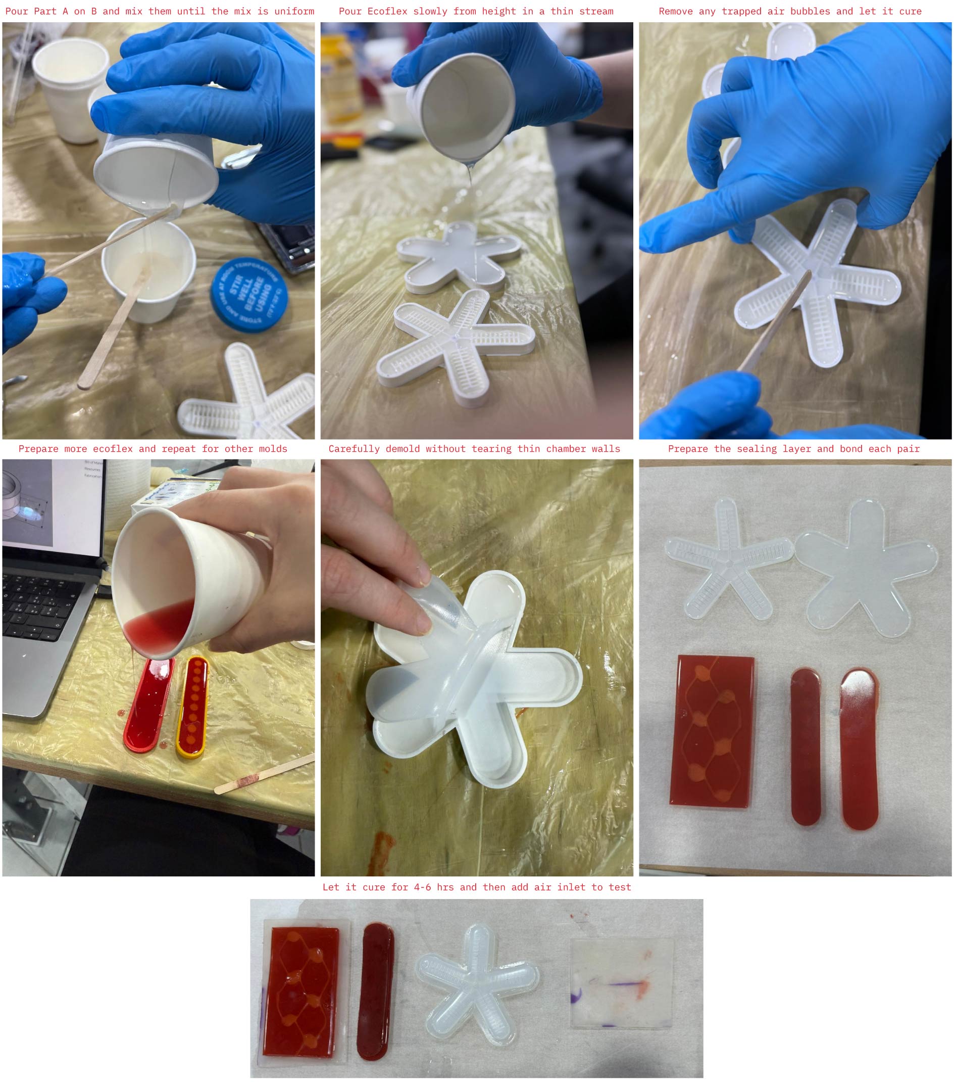 Step 10: Bond (seal the channels): Spread a thin fresh Ecoflex mix as “silicone glue” on the mating surfaces, Align and press together, clamp lightly, and cure again.