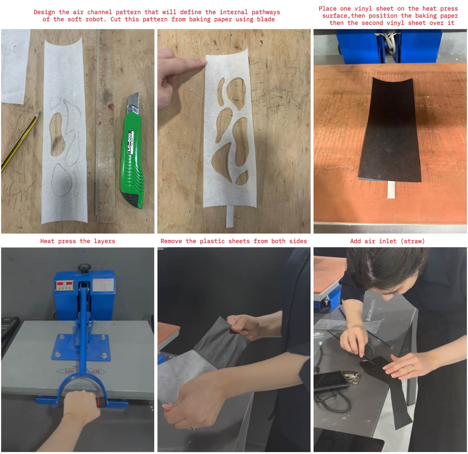 Step 1: Prepare the design: Design the air channel pattern that will define the internal pathways of the soft robot. Cut this pattern from baking paper using laser cutter or with scissors, ensuring clean edges and continuous channels. Afterwards design the vinyl layers that will sandwich the air channel pattern in between. Don't forget to take into consideration the air inlet.