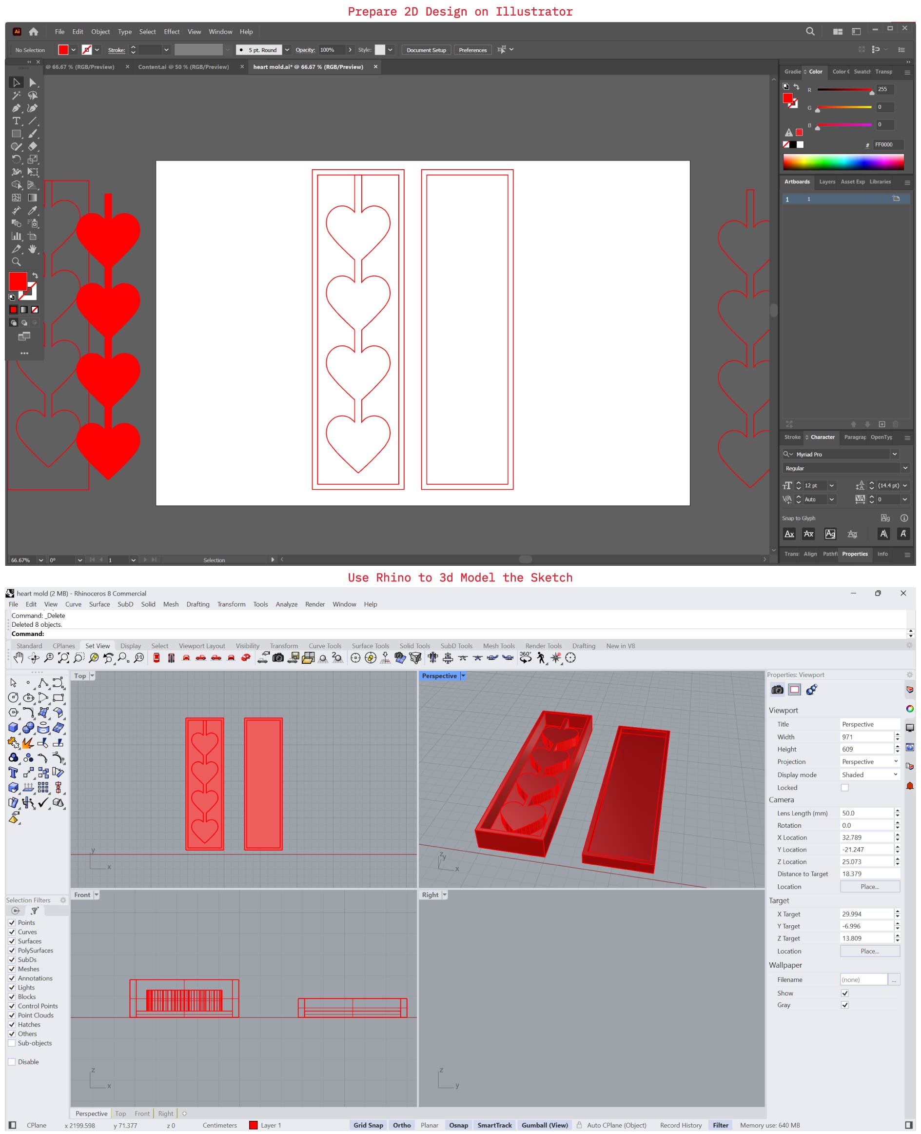 I enjoy incorporating simple heart forms into my design experiments, so in this project I aimed to inflate a row of hearts. The process began with a 2D mold sketch in Illustrator, followed by 3D modeling in Rhino and final fabrication through 3D printing.