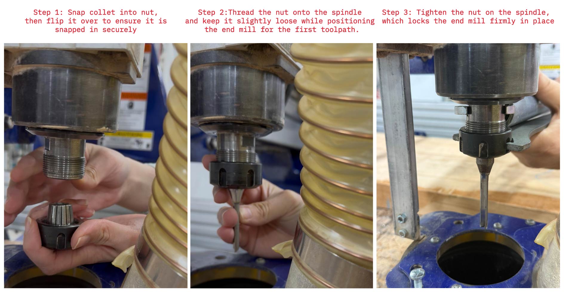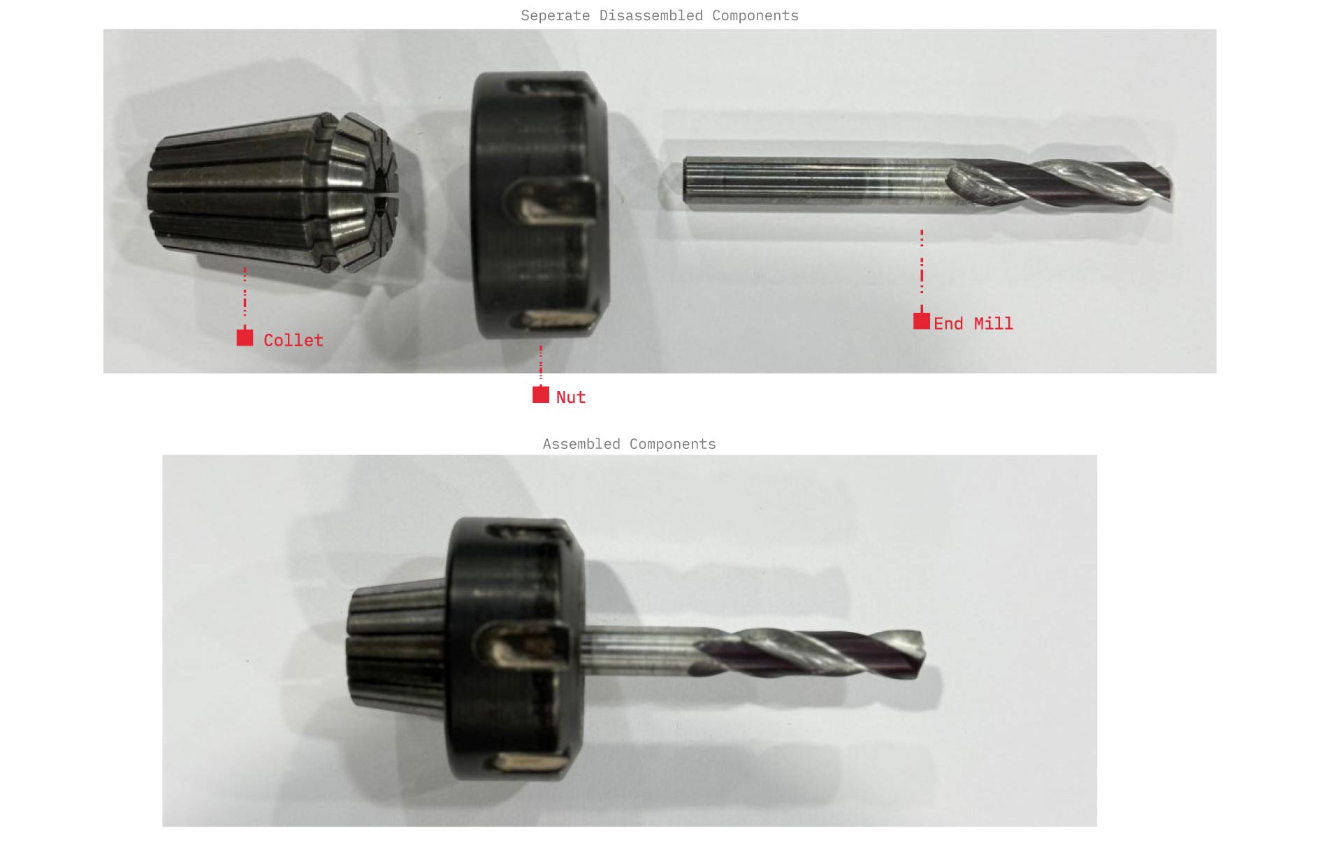 The Nut often called the collet nut, is the component that screws onto the spindle to tighten the collet. As you rotate the nut, it compresses the collet, which in turn clamps the tool (end mill) securely in place.